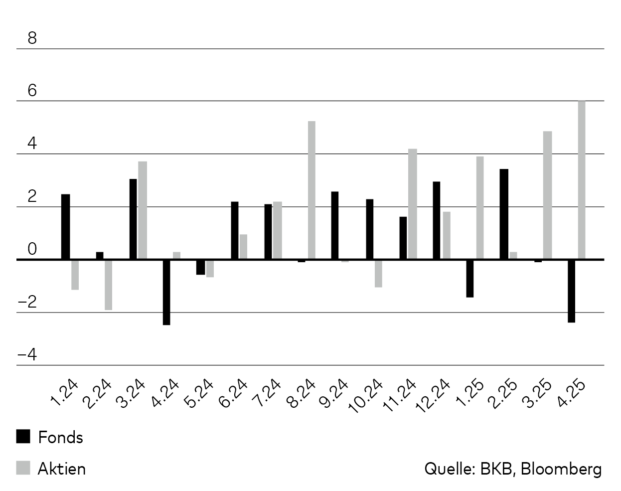 In unserer Anlagestrategie konnten wir unsere Erwartung einer Kehrtwende Trumps für Zukäufe von Aktien kurz nach dem Liberation Day nutzen. Ende April haben wir einen guten Teil der Gewinne realisiert. Wir halten derzeit wieder eine taktisch neutrale Positionierung.