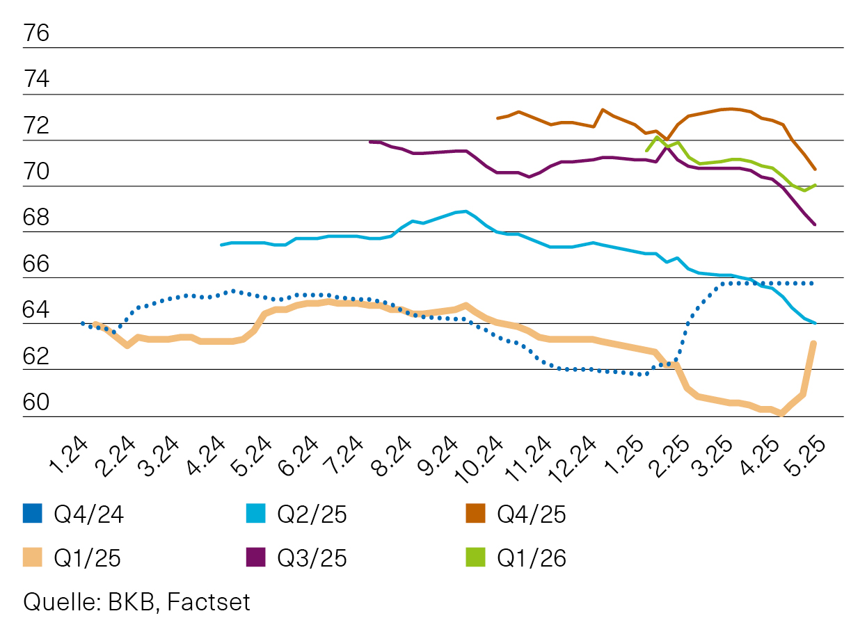 Im April veröffentlichten zahlreiche Unternehmen ihre Geschäftszahlen für das erste Quartal 2025. Nachdem die Aktienanalysten ihre Gewinnschätzungen für den S&P-500-Index vor Beginn der Berichtssaison deutlich nach unten korrigiert hatten, konnten etwa 75 % der Unternehmen diese übertreffen. Das Niveau der Gewinne liegt jedoch unter dem des letzten Quartals, und auch die höheren Gewinnerwartungen für die nächsten Quartale werden weiterhin nach unten revidiert (Abb. 2).