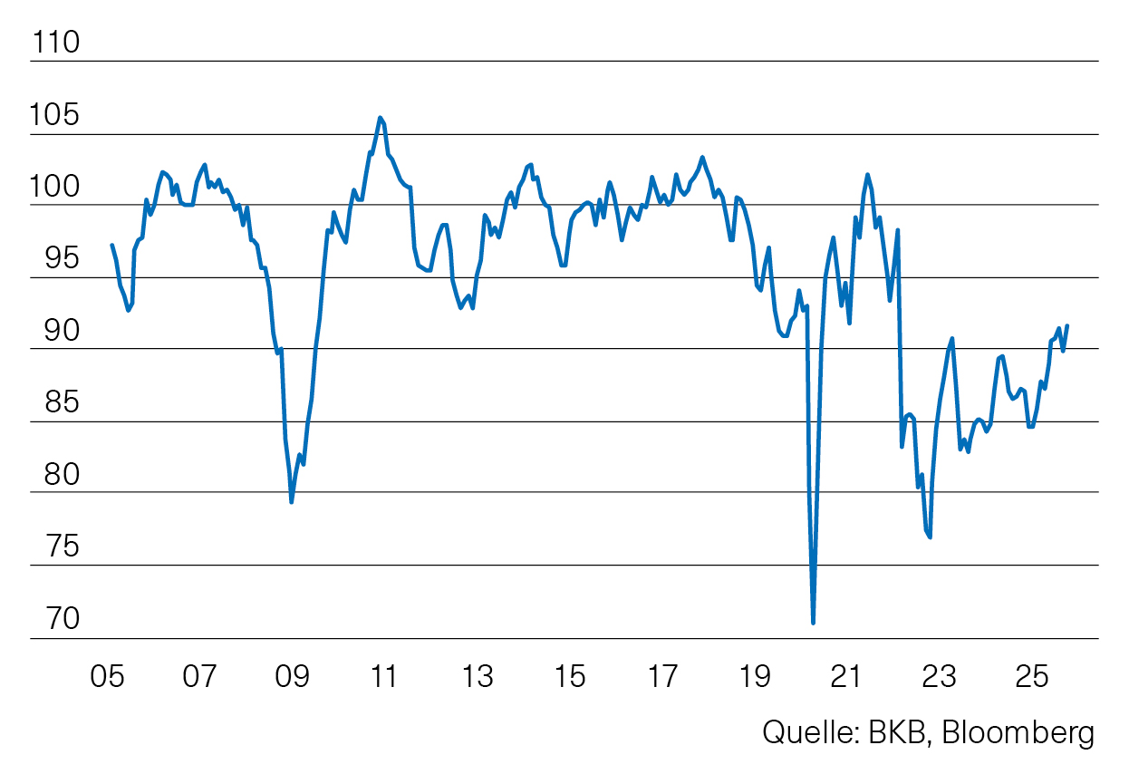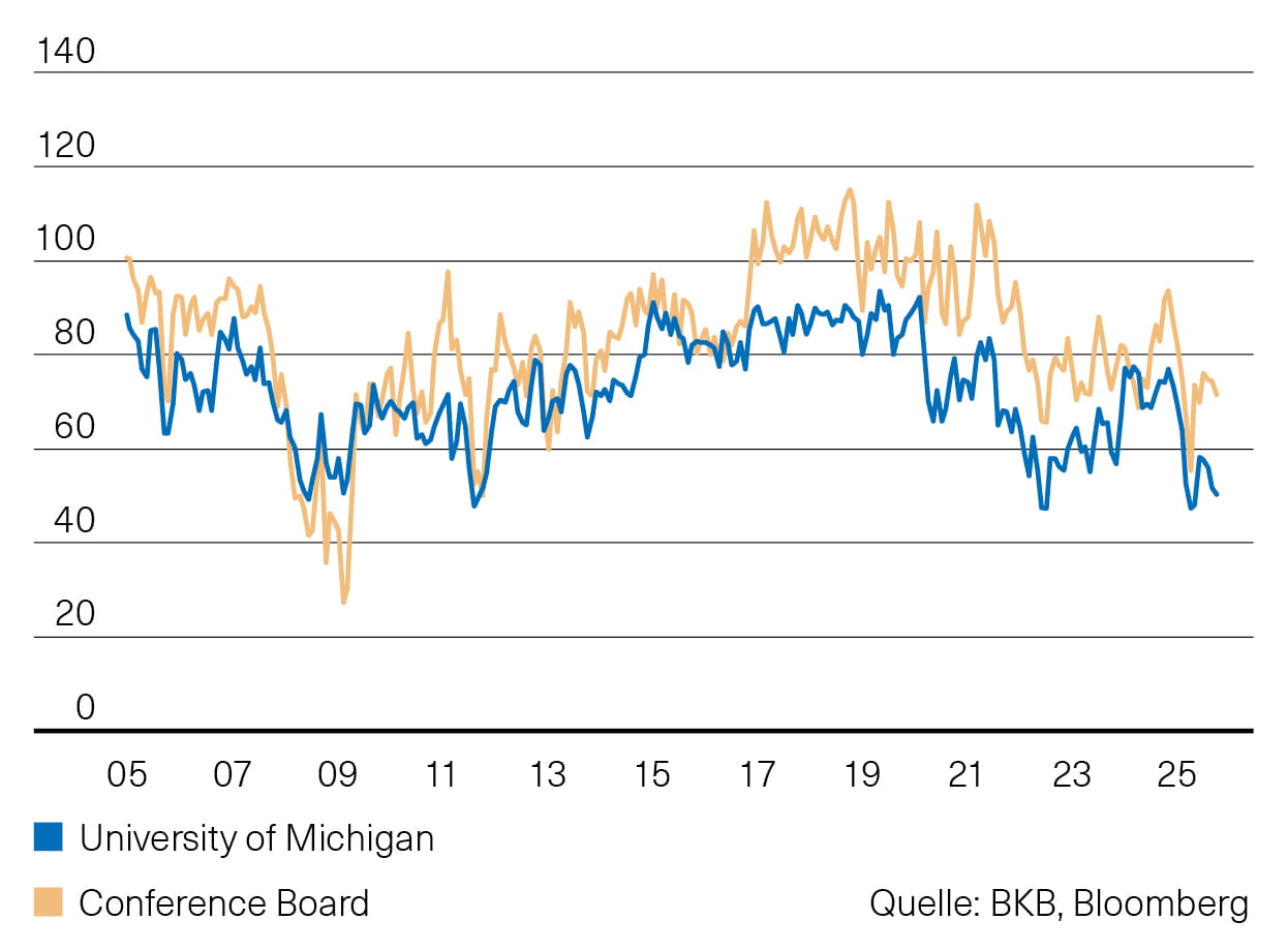 In den Vereinigten Staaten geht der Shutdown bereits in den zweiten Monat und immer mehr Veröffentlichungen wichtiger Konjunkturdaten fallen ihm zum Opfer. War es vor gut einem Monat der US-Arbeitsmarktbericht für September, so blieben in der letzten Oktoberwoche die Veröffentlichung der ersten Schätzung für die Q3-Zahlen des BIP sowie der von der US-Notenbank stark beachtete PCE-Deflator als Mass für die US-Inflation aus. Publiziert wurde dagegen das Verbrauchervertrauen des Conference Board. Die Erwartungskomponente liegt mit 71.5 Punkten weiterhin deutlich unter dem Durchschnitt der letzten 20 Jahre von fast 85 Punkten. Ein ähnliches Bild zeigt die von der University of Michigan ermittelte Konsumentenstimmung. Hier liegt die Erwartungskomponente für den entsprechenden Zeitraum nur geringfügig über den Tiefständen der Krisenjahre dieses Jahrtausends (Abb. 1). Die gedrückte Stimmung unter den Konsumenten dürfte dafür sorgen, dass sich die Konjunktur in den USA auch in den kommenden Quartalen wenig dynamisch entwickeln wird. Die Konsensprognose für 2026 signalisiert einen Anstieg des BIP von weniger als 2 %.
