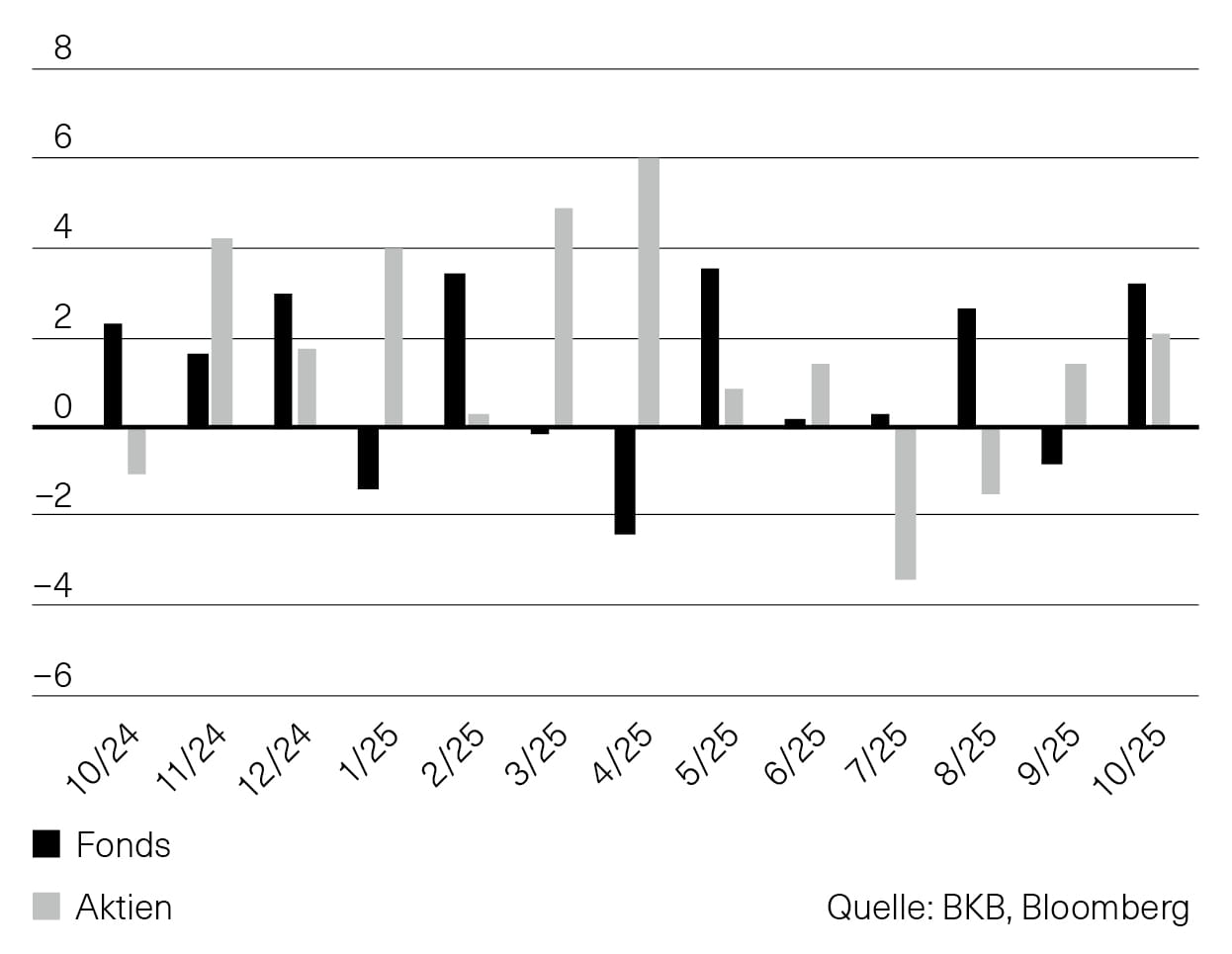 Im Oktober entwickelten sich die Renditen zehnjähriger Staatsanleihen unterschiedlich. In den USA lag die Rendite bei etwa 4,08 % Ende Monat. In Deutschland betrug sie rund 2,63 %, während die Rendite in der Schweiz mit etwa 0,15 % weiterhin auf einem sehr niedrigen Niveau blieb. Für die kommenden Monate zeichnen sich unterschiedliche Trends ab. In den USA könnte die Rendite nach dem jüngsten Zinscut der Fed etwas nachgeben – insbesondere, falls sich die wirtschaftliche Abkühlung weiter verstärkt. In Deutschland spricht die stabile Inflation eher für einen leichten Anstieg der Renditen. In der Schweiz dürften die Renditen auf ihrem niedrigen Niveau verharren, gestützt durch die Geldpolitik der SNB. Wir behalten unsere Untergewichtung bei den Obligationen in CHF bei.