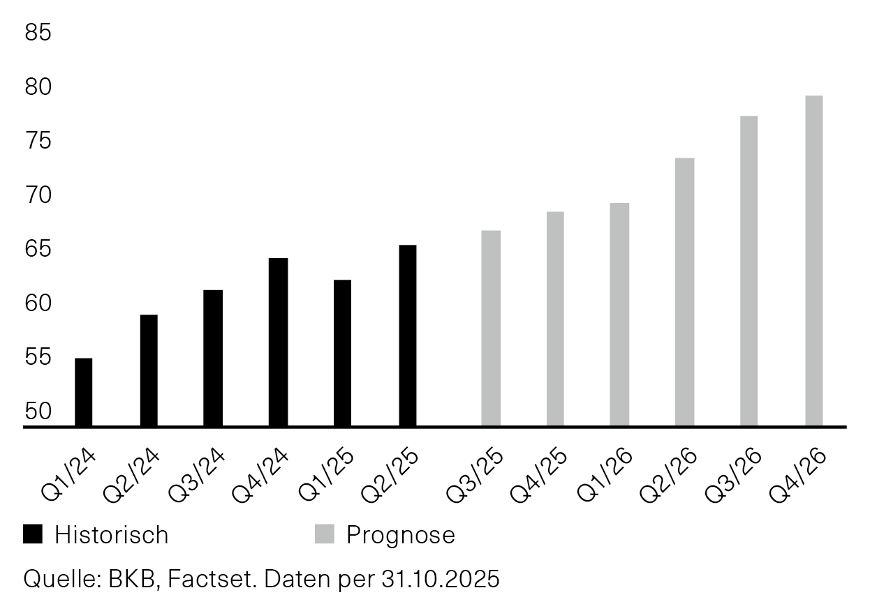 Zum Monatsende Oktober hatten knapp zwei Drittel der Unternehmen aus dem S&P-500-Index ihre Geschäftszahlen für Q3/2025 veröffentlicht. Gut 80 % konnten dabei die Gewinnerwartungen der Analysten übertreffen. Das Gewinnwachstum gegenüber dem Vorjahresquartal liegt auf Indexebene insgesamt über 10 % und ist im Technologiesektor am höchsten, gefolgt von Versorger- und Finanztiteln mit jeweils über 20 %. Das solide Gewinnwachstum und die weiterhin positiven Erwartungen (Abb. 2) werden auch als Rechtfertigung für die historisch hohen Bewertungen herangezogen.