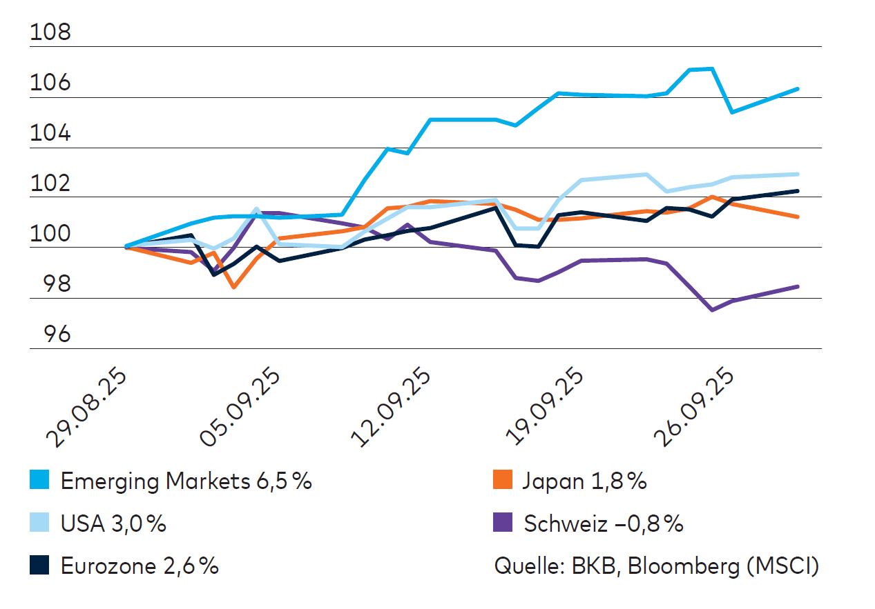 Zum Ende des dritten Quartals befanden sich die globalen Aktienmärkte überwiegend im Aufwind. Treiber waren im September insbesondere die anhaltende Euphorie um künstliche Intelligenz sowie die Einleitung von Zinssenkungen durch die amerikanische Notenbank Fed. Schwellenländeraktien entwickelten sich deutlich besser als ihre Pendants in den Industrieländern. Aktienmärkte mit einem hohen Anteil an Minengesellschaften wie Peru, Südafrika und Mexiko profitierten vom rasanten Goldpreisanstieg, Korea und Taiwan von ihrem hohen IT-Exposure. Auch chinesische Aktien wie Alibaba und Baidu stiegen angesichts von AI-Investitionsvorhaben enorm. Der technologielastige US-Aktienmarkt legte um 3 % in CHF zu, wohingegen die europäischen Aktienmärkte ein gemischtes Bild zeigten. Der Aktienkurs des niederländischen Halbleiterherstellers ASML, mittlerweile der grösste Titel im MSCI Eurozone Index, stieg um 30 %, während die deutschen Automobilwerte aufgrund magerer Aussichten abgestraft wurden. Die Performance von Schweizer Aktientiteln war zum Quartalsende durchwachsen, der MSCI Switzerland Index beendete den September im Minus (Abb. 1).
