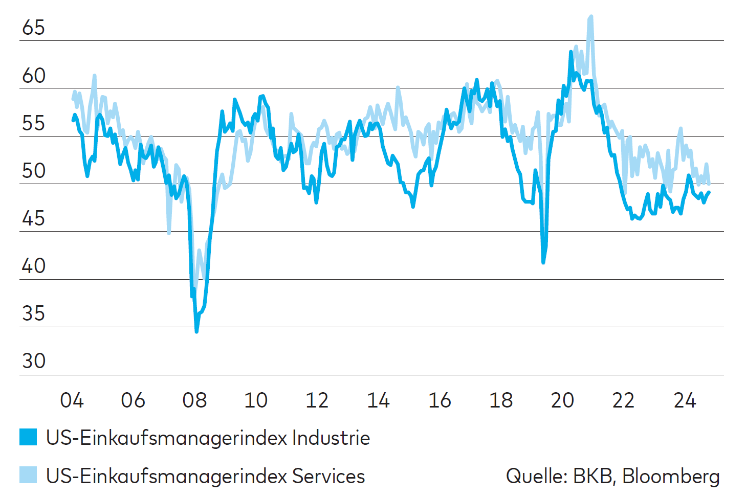Zu Beginn jedes Monats warten Anlegerinnen und Anleger gespannt auf die Veröffentlichung des US-Arbeitsmarktberichts. Dieser gibt Aufschluss über die aktuelle Lage der Beschäftigung und lässt Rückschlüsse auf mögliche geldpolitische Entscheidungen der US-Notenbank (Fed) zu. In diesem Monat ist der für den 3. Oktober angekündigte Arbeitsmarktbericht zunächst dem Government Shutdown zum Opfer gefallen. Die Börsen hat dies aber nicht aus der Ruhe gebracht. Viele andere wichtige Daten wurden bereits zuvor publiziert. Wichtig waren in diesem Zusammenhang die Einkaufsmanagerindizes für die Bereiche Industrie und Dienstleistungen (Abb. 1). Dabei ist besonders der Dienstleistungsindex hinter den Erwartungen zurückgeblieben und auf die kritische Marke von 50 Punkten gesunken. Die Subindizes signalisieren anhaltenden Preisdruck und eine eingetrübte Lage bezüglich der Beschäftigungsentwicklung. Auch die Stimmung unter den Konsumenten bleibt unter Druck. Somit hat sich insgesamt nichts Grundsätzliches im Datenset verändert, es bleibt bei einer weiterhin unterdurchschnittlichen Konjunkturdynamik.