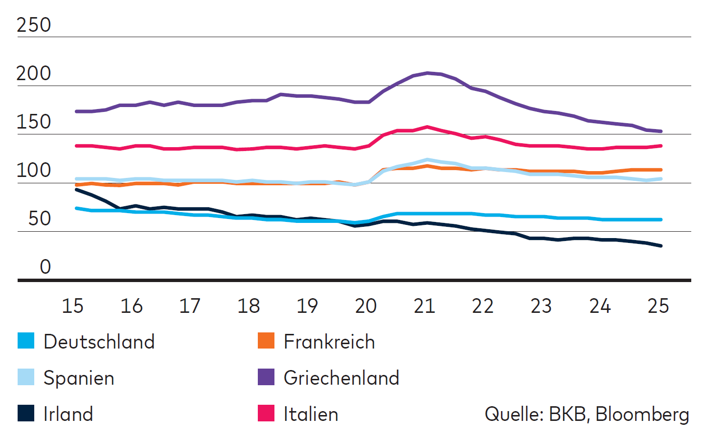 Kaum im Amt, schon gescheitert. Die neue Regierung unter Premierminister Lecornu war nur wenige Stunden nach ihrer Vorstellung bereits Makulatur. Sie ist an der Aufgabe zerbrochen, einen Kompromiss im Streit um den notwendigen Sparhaushalt zu finden. Ein Kompromiss wäre deshalb wichtig, weil Frankreich – immerhin die zweitgrösste Volkswirtschaft in der EU – sich einer hohen und in der Tendenz steigenden Staatsverschuldung gegenübersieht (Abb. 2). Für Europa stellt damit die Grande Nation einen Risikofaktor für die wirtschaftliche Entwicklung dar. An der Konsensprognose für das BIP lässt sich das aber nicht wirklich erkennen, der Median der Prognosen liegt für 2026 bei 1,1 %.