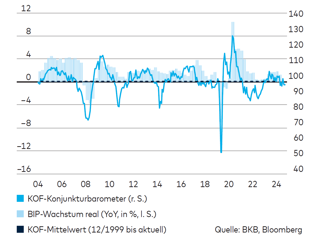 Auch wenn sich der Schweizer Einkaufsmanagerindex für den Dienstleistungsbereich von seinem jüngsten Einbruch wieder erholen konnte, ist dies kein Signal für eine deutlich dynamischere Konjunkturentwicklung. Der Index liegt mit 51.3 Punkten nur leicht über der Wachstumsschwelle von 50 Punkten. Zudem bewegt sich der Index für die Industrie weiter im kontraktiven Bereich. Er ist gesunken und wird aktuell mit 46.3 Punkten angegeben. Und auch das KOF-Konjunkturbarometer liegt mit 98 Punkten weiter unter seinem langfristigen Durchschnitt (Abb. 3). Die Unsicherheiten für die konjunkturelle Entwicklung bleiben bestehen.