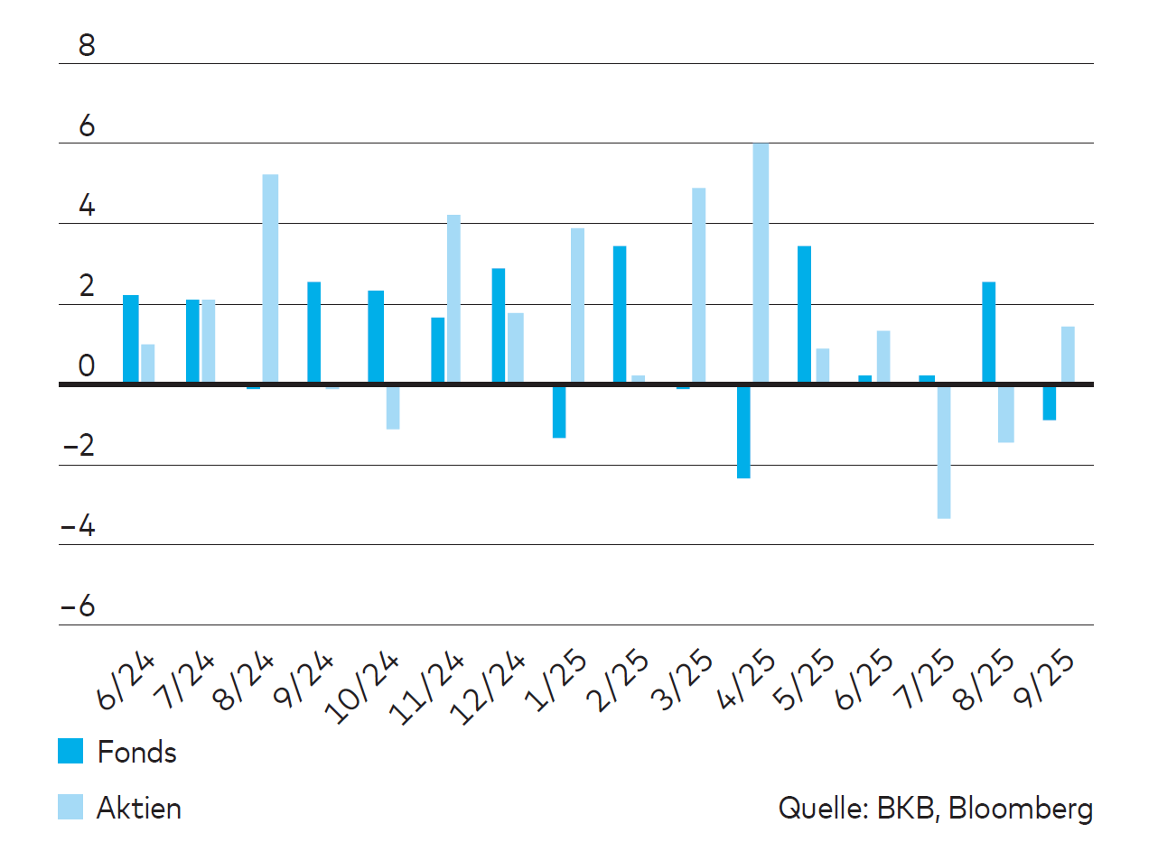 Unsere Aktienzukäufe direkt nach der Ankündigung neuer US-Zölle am 2. April und unsere stärkere taktische Gewichtung von Gold haben zum Anlageerfolg spürbar beigetragen. Unsere Erwartungen zur globalen Geldpolitik mit moderat fallenden Leitzinsen in den USA, mit beendeten Leitzinssenkungen für den Euro und stabilem Nullzins für den CHF waren insgesamt zutreffend. Auch dank unseren Einschätzungen wurde im aktuellen Jahr 2025 bis zum 10. Oktober beispielsweise mit unserem CHF-orientierten, «ausgewogenen» Vermögensverwaltungsmandat eine Rendite von rund 8% erzielt.