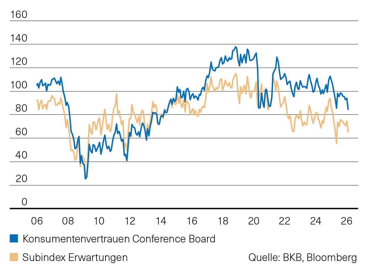 Nachdem die zweite Schätzung die hohe Wachstumsrate des BIP für das 3. Quartal (über 4 %, QoQ, annualisiert) – dank einer guten Entwicklung des privaten Verbrauchs und anhaltender Verzerrungen beim Aussenbeitrag infolge der Importzölle – bestätigt hat, gehen die Auguren für das 4. Quartal 2025 wieder von einer etwas schwächeren Dynamik aus. Für das Jahr 2026 hat dagegen der Optimismus unter den Prognostikern weiter zugenommen. Lag die Konsensprognose Ende Dezember des vergangenen Jahres für 2026 noch bei 2%, wurde diese zwischenzeitlich auf 2,4% angehoben. Unterstützung erhält diese Prognose von dem jüngst veröffentlichten Einkaufsmanagerindex der Industrie. Dieser wird mit 52.6 Punkten angegeben. Der Wert liegt damit erstmals seit einem Jahr wieder über der kritischen 50-Punkte-Marke und signalisiert damit eine Expansion der US-Wirtschaft im Bereich der Industrie. Positiv ist festzuhalten, dass der Subindex der Auftragseingänge auf 57.1 Punkte zulegen konnte. Zur Vorsicht mahnt dagegen die Stimmung unter den Verbrauchern. Das Konsumentenvertrauen des Conference Board hat weiter nachgegeben. Der entsprechende Index ist auf dem tiefsten Stand seit Mitte 2014