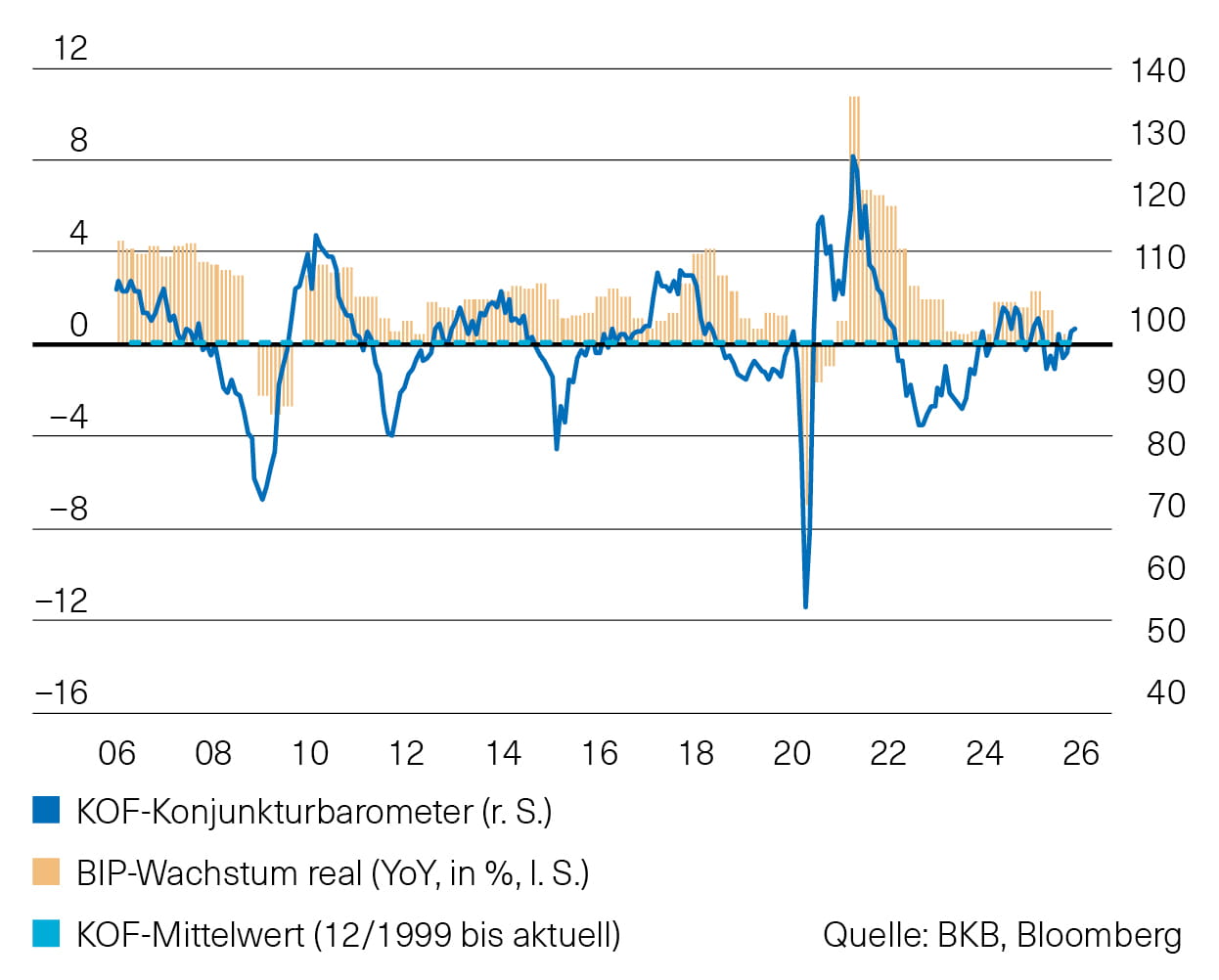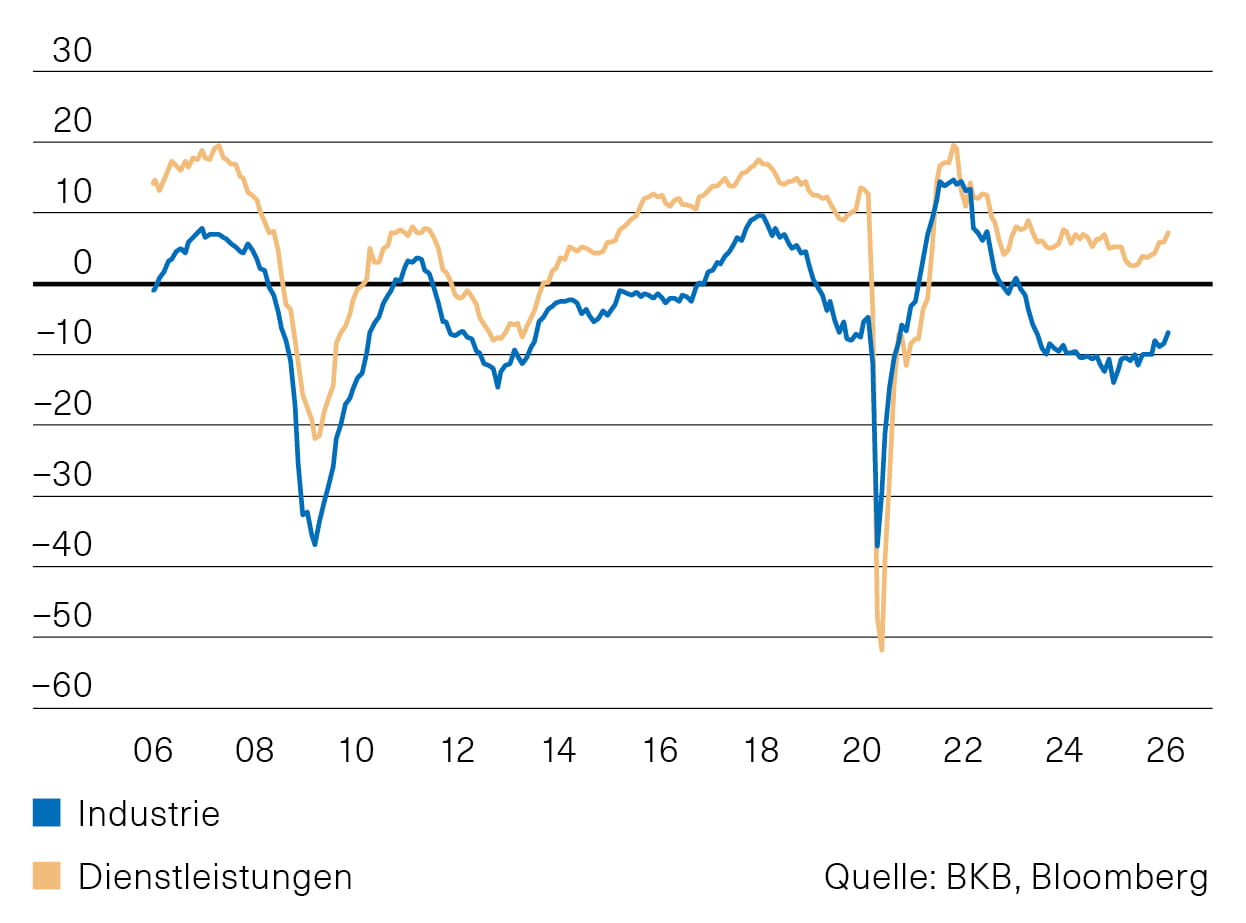 In der Schweiz konnte der Einkaufsmanagerindex im Januar wieder zulegen. Mit 48.8 Punkten bleibt er aber leicht im kontraktiven Bereich. Der Wert deutet damit auf eine wenig dynamische konjunkturelle Entwicklung in der Eidgenossenschaft hin. Dieses Bild wird auch vom KOF-Konjunkturbarometer bestätigt. Dieses hat zuletzt wieder leicht nachgegeben und bewegt sich nun sehr nahe am langfristigen Durchschnitt (Abb. 3). An der Konsensprognose hat sich nichts verändert, sie verspricht für die Schweiz nach wie vor ein Wachstum des BIP für 2026 von 1,2 %.