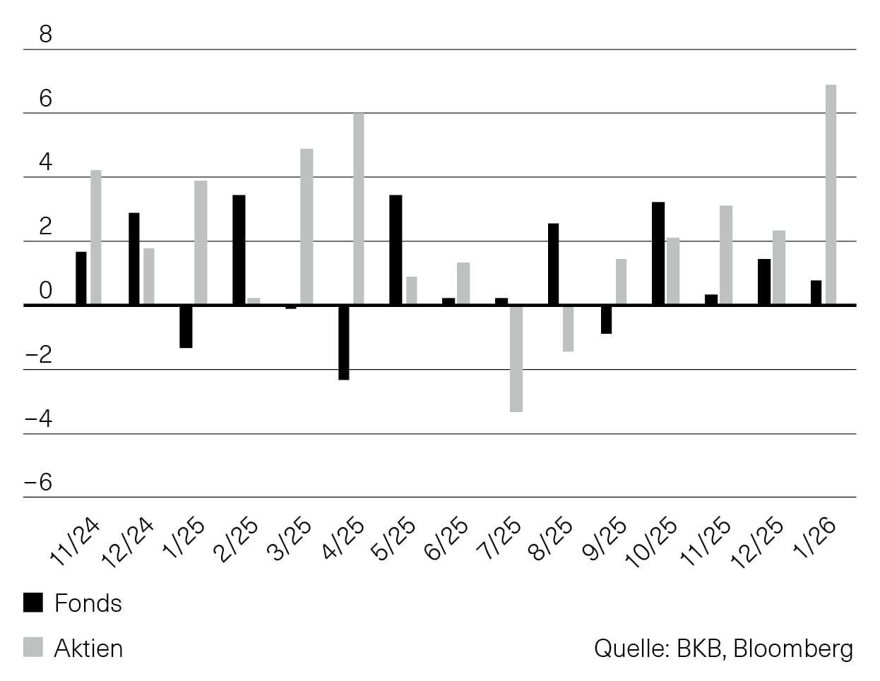 Die ersten Wochen des neuen Jahres waren durch ausgeprägtes auf und ab an den Finanzmärkten geprägt. Der Schweizer Aktienindex SPI gehört dabei zu den beständigeren Werten und gewinnt seit Anfang Jahr rund 2%. Besser war die Rendite von japanischen Aktien mit 5.5%. Hingegen war die Rendite des US-Tech Index Nasdaq negativ bei -3.75% (alle Angaben sind Renditen in CHF per 6. Februar 2026).