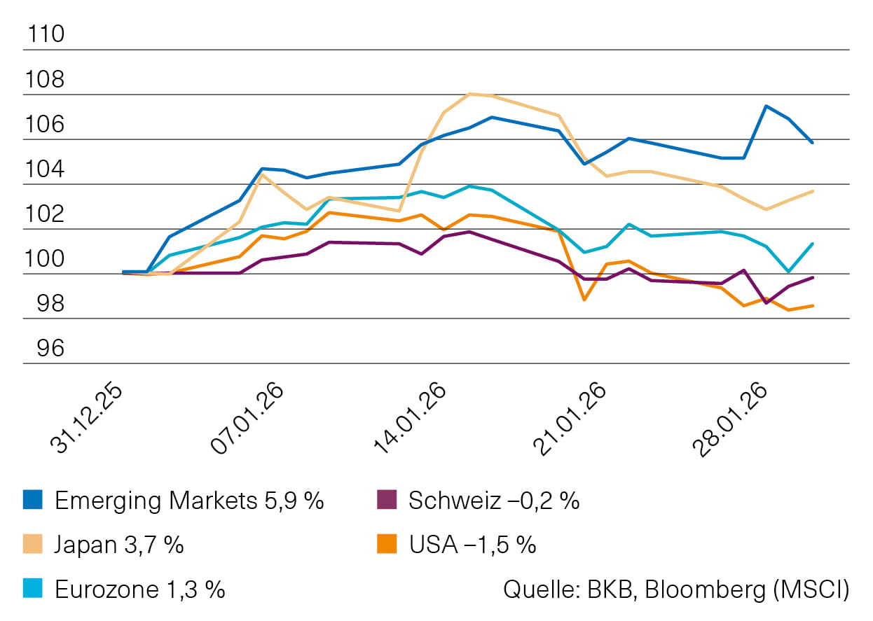samt Zollandrohungen gegen Europa, der Ermittlungen gegen den amerikanischen Notenbankpräsidenten und der Unruhen im Iran anstieg. Während die damit einhergehenden Kursrückgänge an den Aktienmärkten vornehmlich vorübergehender Natur waren, sorgte ein Anstieg des Schweizer Frankens für eine Performanceminderung aus Sicht von Schweizer Investoren. Demzufolge beendete der US-Aktienmarkt den Januar in CHF im Minus, während Schwellenländer- und japanische Aktien deutlich zulegen konnten (Abb. 1).
