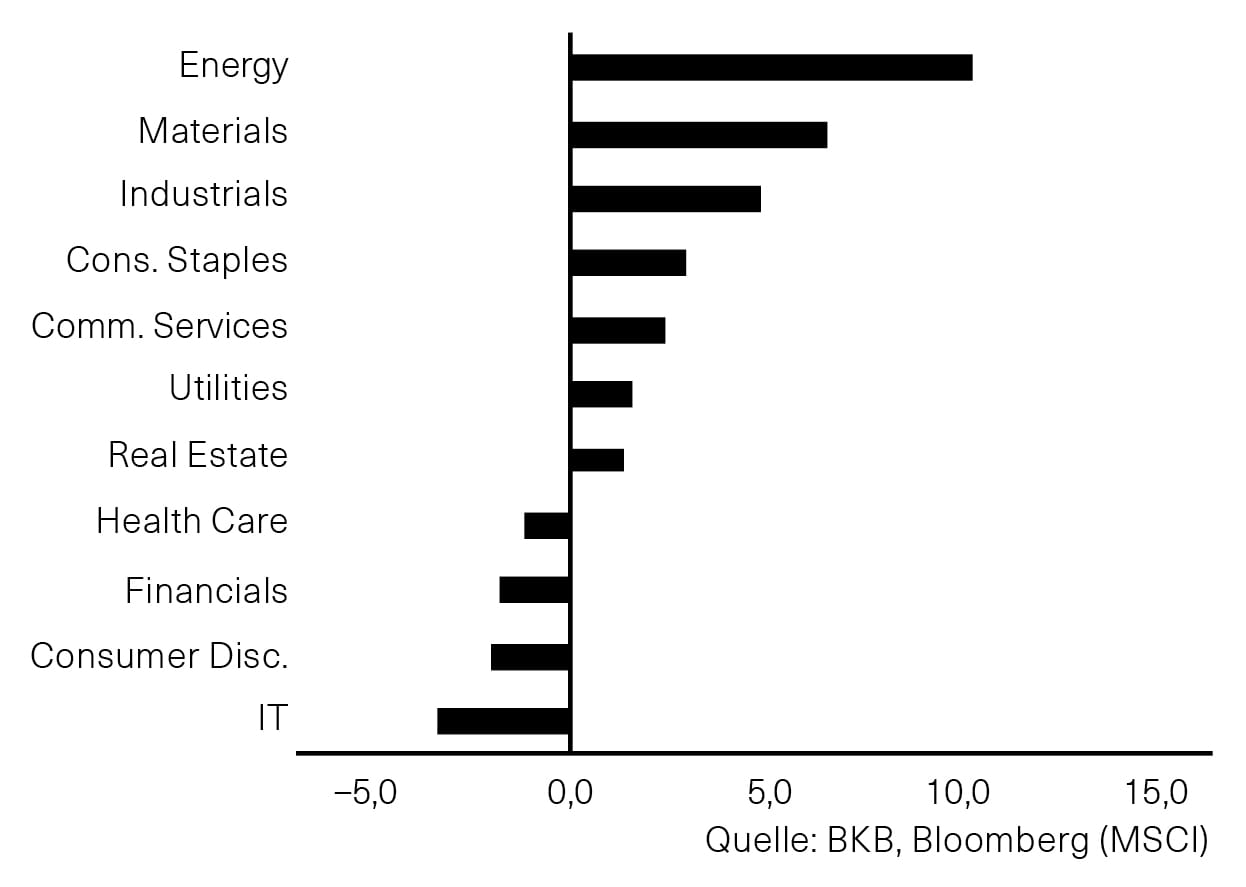 Abb. 2: Globale Sektoren – relative Performance zum Gesamtmarkt im Januar 2026, in % (Absolute Performance MSCI World in CHF: –0,5%)