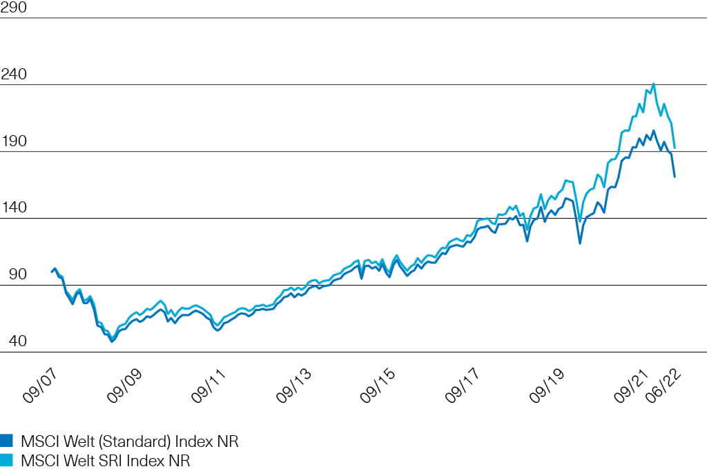 Müssen Sie deshalb auf Rendite verzichten? Ganz und gar nicht. Langfristig ist nachhaltiges Anlegen genauso erfolgreich wie klassische Instrumente. Das zeigt die nachstehende Grafik: