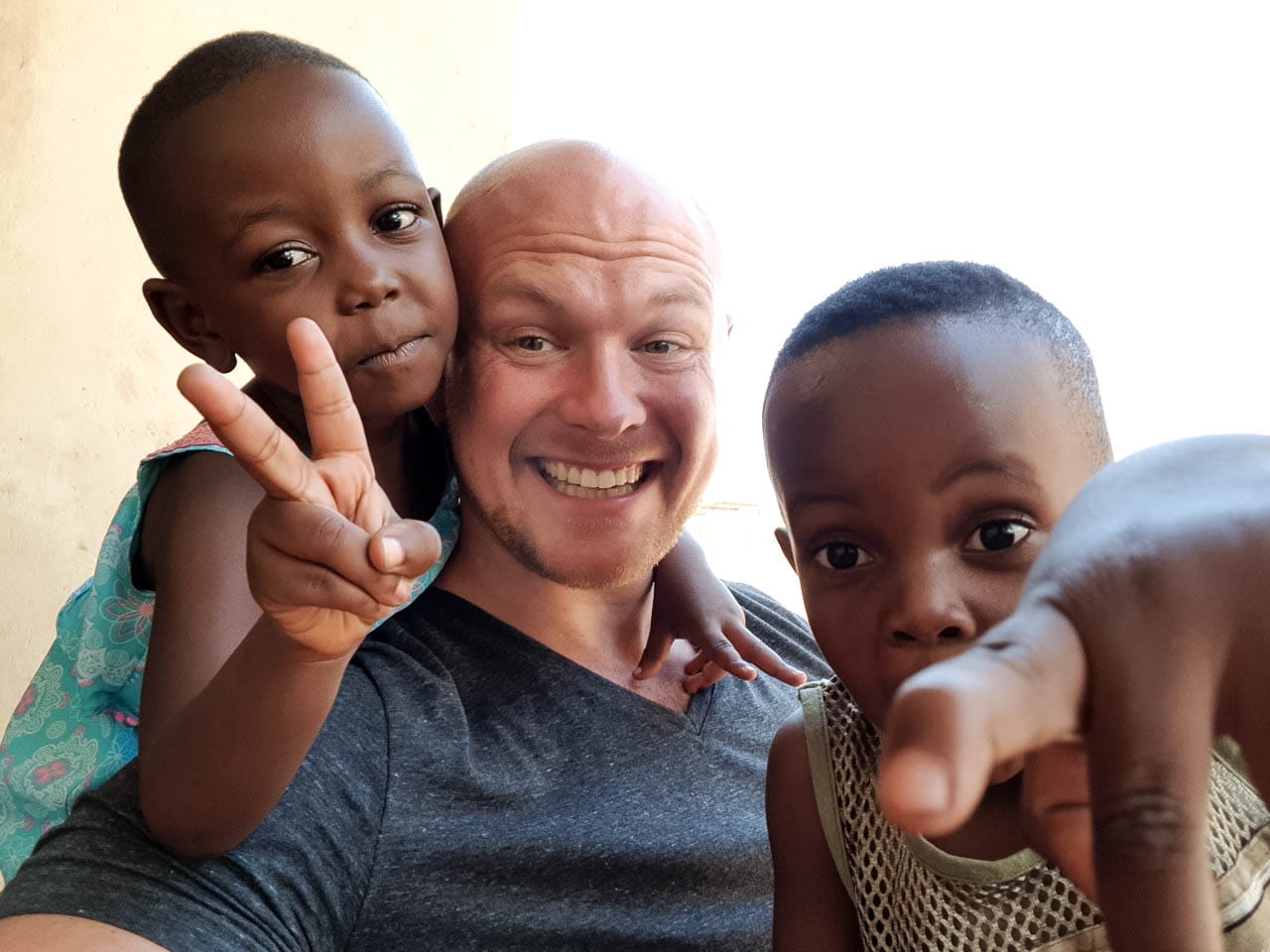 Bild: Alexander 2019 auf Reisen (Kampala, Uganda) mit zufällig getroffenen Kindern ohne Berührungsängste, dafür mit Sympathie für Smartphones.