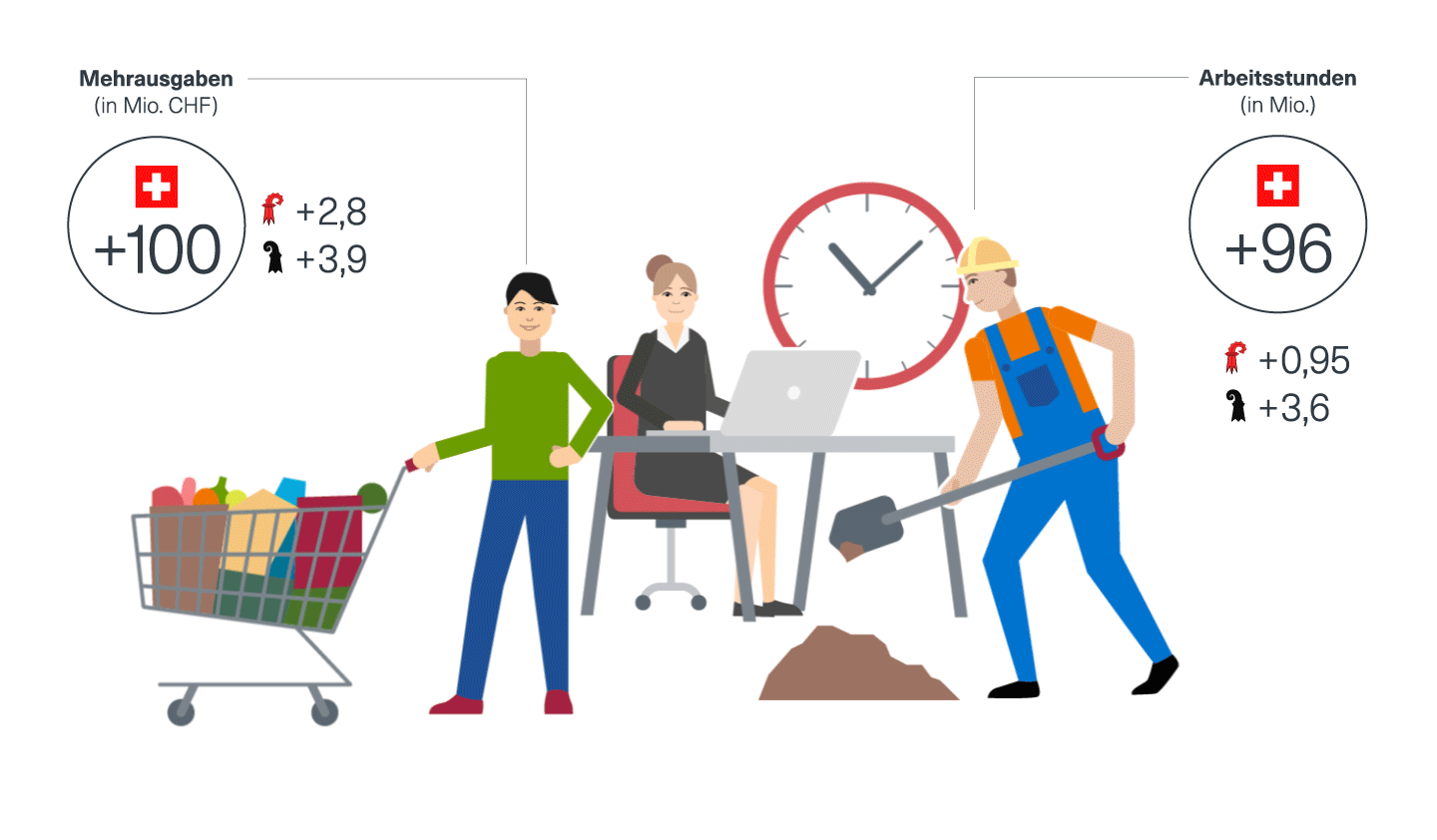 Im Kanton Basel-Stadt werden pro zusätzlichen Arbeitstag rund 1.2 Mio. Arbeitsstunden und im Kanton Basel-Landschaft rund 950'000 Stunden zusätzlich geleistet. Allerdings erhalten die Schweizer Beschäftigten für die Mehrleistung nicht auch zwingend mehr Gehalt, sondern das bleibt in den meisten Fällen auf Jahresbasis fixiert. Die zusätzlich geleisteten Stunden führen folglich zu einer gewissen Umverteilung von Arbeitnehmern zu Arbeitgebern. Ein zusätzlicher Tag ist auch mit zusätzlichen Ausgaben verbunden. Muss man doch mit seinem (fixen) Gehalt einen Tag länger auskommen bzw. hat weniger für die Ersparnisbildung zur Verfügung. Im Detailhandel werden beispielsweise durch Schalttage rund 100 Mio. CHF zusätzlich für Nahrungsmittel ausgegeben. Kaum zu vermeidende Mehrausgaben sind auch bei anderen Konsumbereichen, beispielsweise dem Energieverbrauch, zu erwarten.
