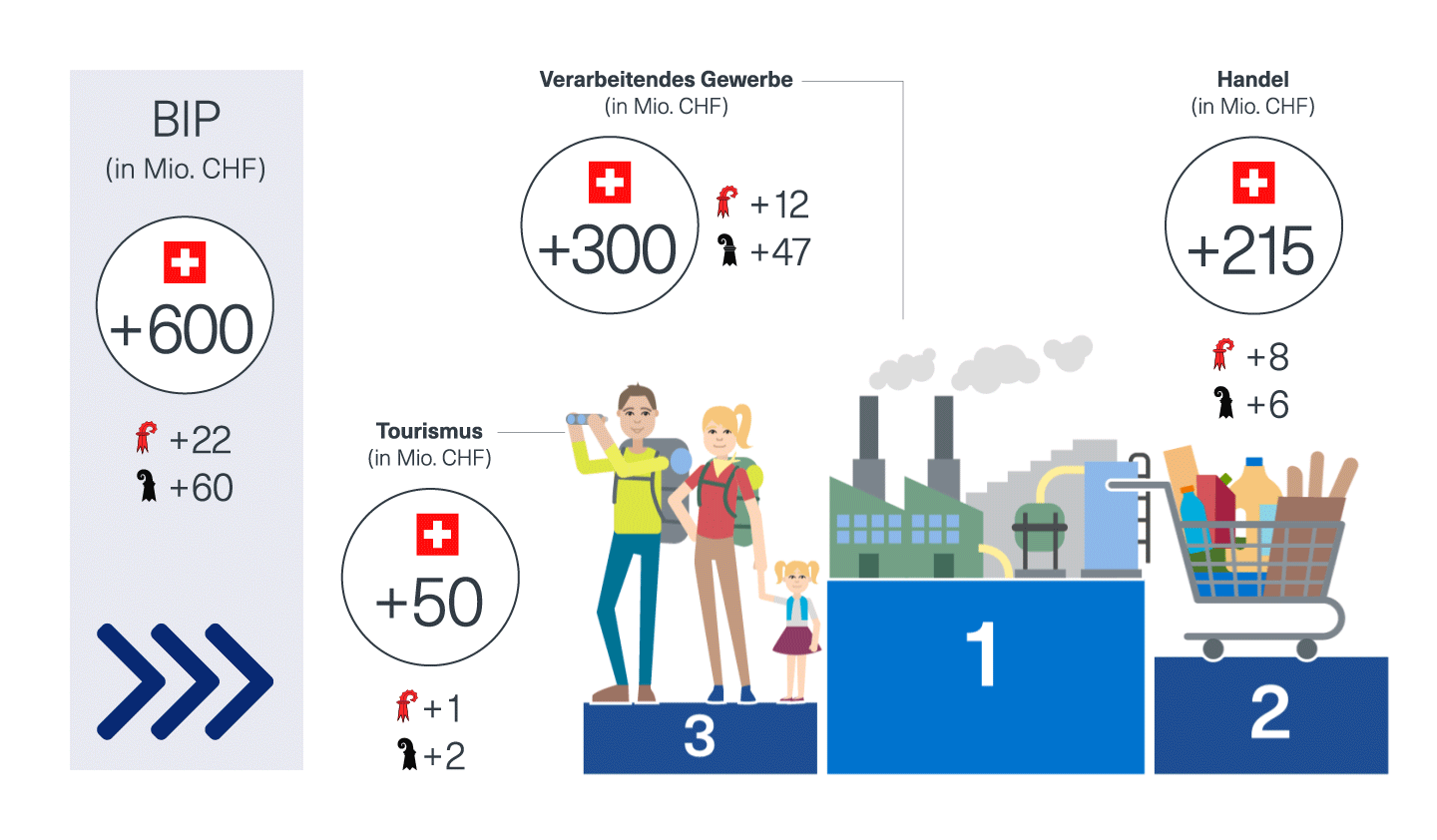 Das Wachstum des Schweizer Bruttoinlandprodukts dürfte 2020 aufgrund der spezifischen Konstellation des Schaltjahres mit drei zusätzlichen Arbeitstagen um knapp 0,1 Prozentpunkte höher ausfallen als im Vorjahr. Die gesamtwirtschaftliche Schweizer Wertschöpfung fällt damit um rund 600 Mio. CHF höher aus als 2019. Zum Vergleich: die Baukosten für den Roche-Turm (Bau 1) betrugen rund 550 Mio. CHF. Branchenseitig profitieren vor allem das verarbeitende Gewerbe (knapp 300 Mio. CHF an zusätzlicher Wertschöpfung), der Tourismussektor (knapp 50 Mio. CHF an zusätzlicher Wertschöpfung) und der Handel1 (knapp 215 Mio. CHF an zusätzlicher Wertschöpfung).