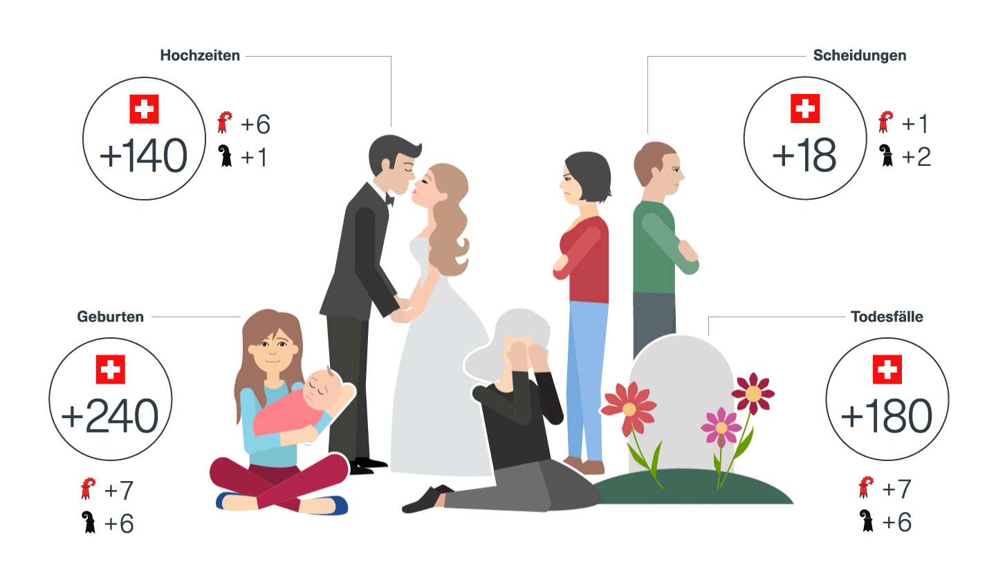 Auch der Zivilstand ändert sich. Im Schnitt heiraten pro Tag rund 112 Paare in der Schweiz. Allerdings gibt es klare Präferenzen bezüglich der Wochentage. Die meisten standesamtlichen Eheschliessungen finden an Freitagen statt (fast 390 pro Freitag im Jahr 2018). Danach folgt der Samstag mit rund 140 Eheschliessungen. Damit kann am Schaltsamstag 2020 mit rund 140 Eheschliessungen gerechnet werden. Bezogen auf konkrete Schalttage wurde der Schweizer Rekord übrigens im Jahr 2008 mit 465 Eheschliessungen aufgestellt. Der Schalttag 2008 war, wie nicht anders zu erwarten, ein Freitag. Am letzten Schaltsamstag im Jahr 1992 gaben sich immerhin 125 Paare das Jawort. Allerdings liessen sich hier auch 18 Paare scheiden. Der bevorzugte Tag für Scheidungen ist übrigens der Dienstag. Konkret auf Schalttage bezogen fällt der historische Scheidungsrekord allerdings auf den Schaltdonnerstag 1996, als schweizweit 72 Schweizer Paare geschieden wurden.