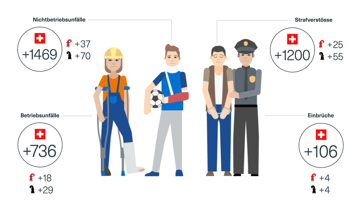 Neben den erwähnten Effekten, führt ein Schaltjahr bzw. ein zusätzlicher Tag leider auch zu negativen Effekten. Über die letzten fünf Jahre verunfallten schweizweit pro Tag durchschnittlich 736 Personen bei der Arbeit (Berufsunfälle) bzw. 1469 in ihrer Freizeit (Nichtberufsunfälle).