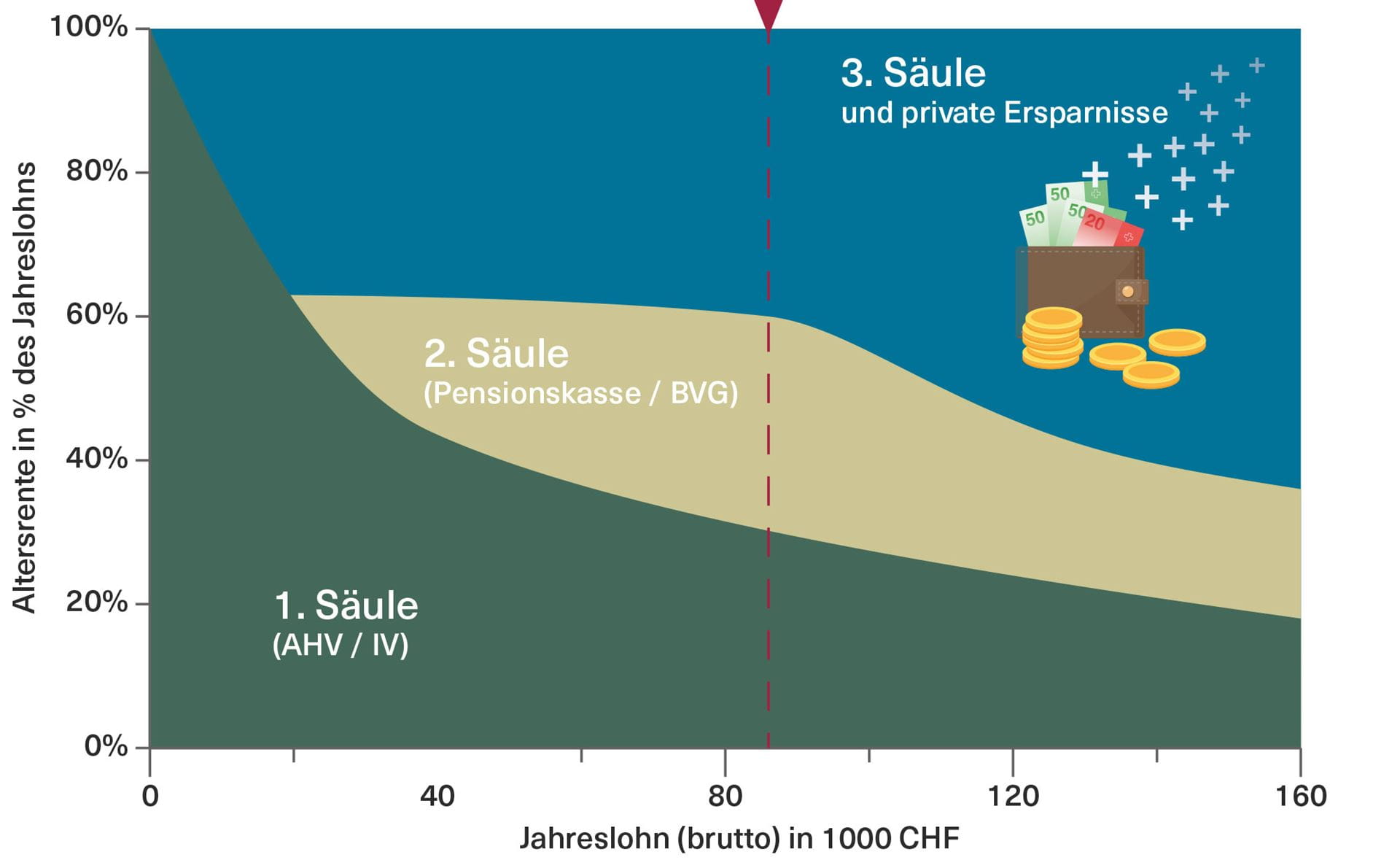 Die obligatorische berufliche Vorsorge (BVG), dient der Sicherung des Lebensstandards nach der Pensionierung. Angestellte, deren Einkommen über 21 510 Franken (Stand: 2021) liegt, haben von ihrem Arbeitgeber Anspruch auf die Versicherung in der Säule 2a. Ziel ist, dass das diese zusammen mit der Existenzsicherung (AHV) nach der Pensionierung ca. 60 Prozent des letzten Einkommens abdeckt. Der Rest sollte durch die dritte Säule abgesichert sein.