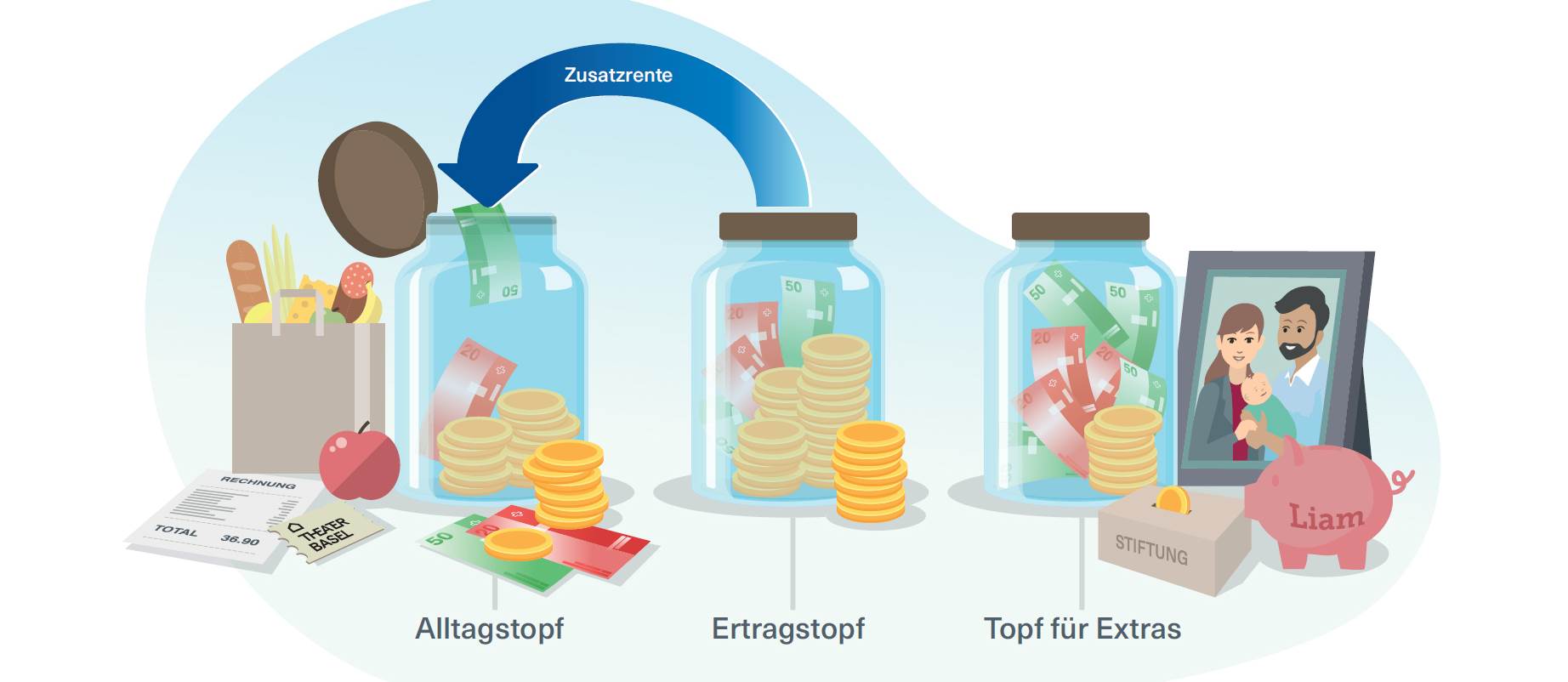 Wichtig ist, die Ausgangslage und die Bedürfnisse zunächst ganzheitlich zu analysieren und ein individuelles Budget für den Alltag zu erstellen. Ihre BKB-Kundenberaterin oder Ihr Kundenberater hilft Ihnen gerne dabei. Ihr Vermögen wird dabei in drei «Töpfe» aufgeteilt. Das Geld im Alltags-Topf ist jederzeit auf dem Konto verfügbar. Das Geld im Ertrags-Topf und im Topf für Extras wird mit Anlagen optimiert, die auf Ihre Bedürfnisse zugeschnitten sind. Der Ertrags-Topf speist den Alltags-Topf in regrelmässigen Abständen, so dass immer genügent Liquidät vorhanden ist.