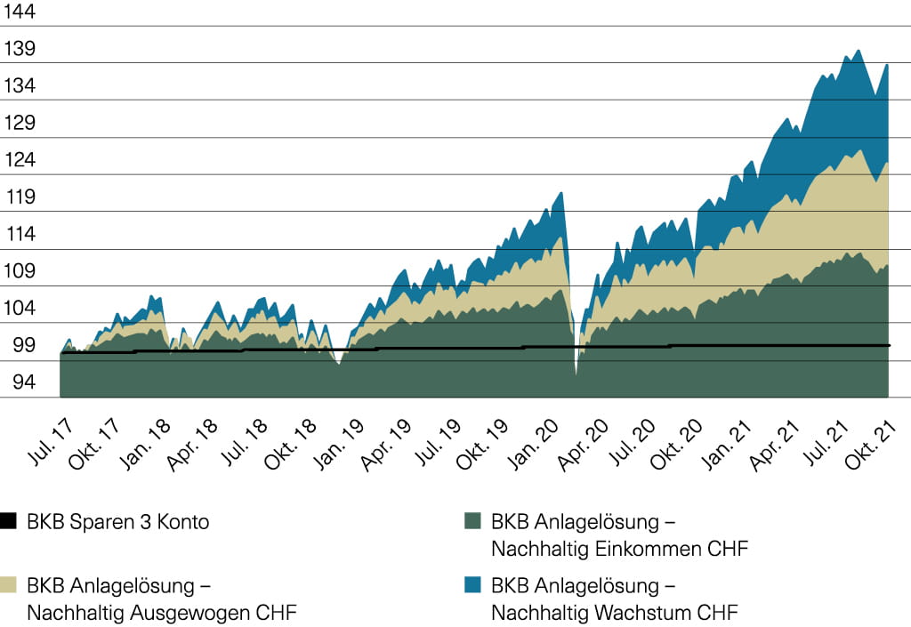 Die dritte Säule lässt sich neben dem klassischen 3a-Konto auch mit Wertschriften (z.B. mit der BKB Anlagelösung Vorsorgesparen) aufbauen. Und die vergangene Entwicklung der gezeigten Anlagelösungen (Grafik 2) spricht Bände: bereits auf den ersten Blick wird deutlich – ein klassisches Konto für die Säule 3a anzulegen lohnt sich im heutigen Niedrigzinsumfeld weniger. Wer also zusätzlich zu den Renditeimmobilien auf Wertschriften setzt, profitiert langfristig von höheren Renditechancen. Auch, wenn es in der vergangenen Zeit einige Kurseinbrüche (unter anderem aufgrund von Covid-19) gegeben hat – dank einem Anlagehorizont von meist mehreren Jahren fallen diese nicht sonderlich ins Gewicht. Denn den Verkaufszeitpunkt bestimmen am Ende immer Sie selbst.Grafik 2: Klassisches Sparen vs. Vorsorgen mit Anlagen - Der Performancevergleich (Index 27.7.2017=100)
