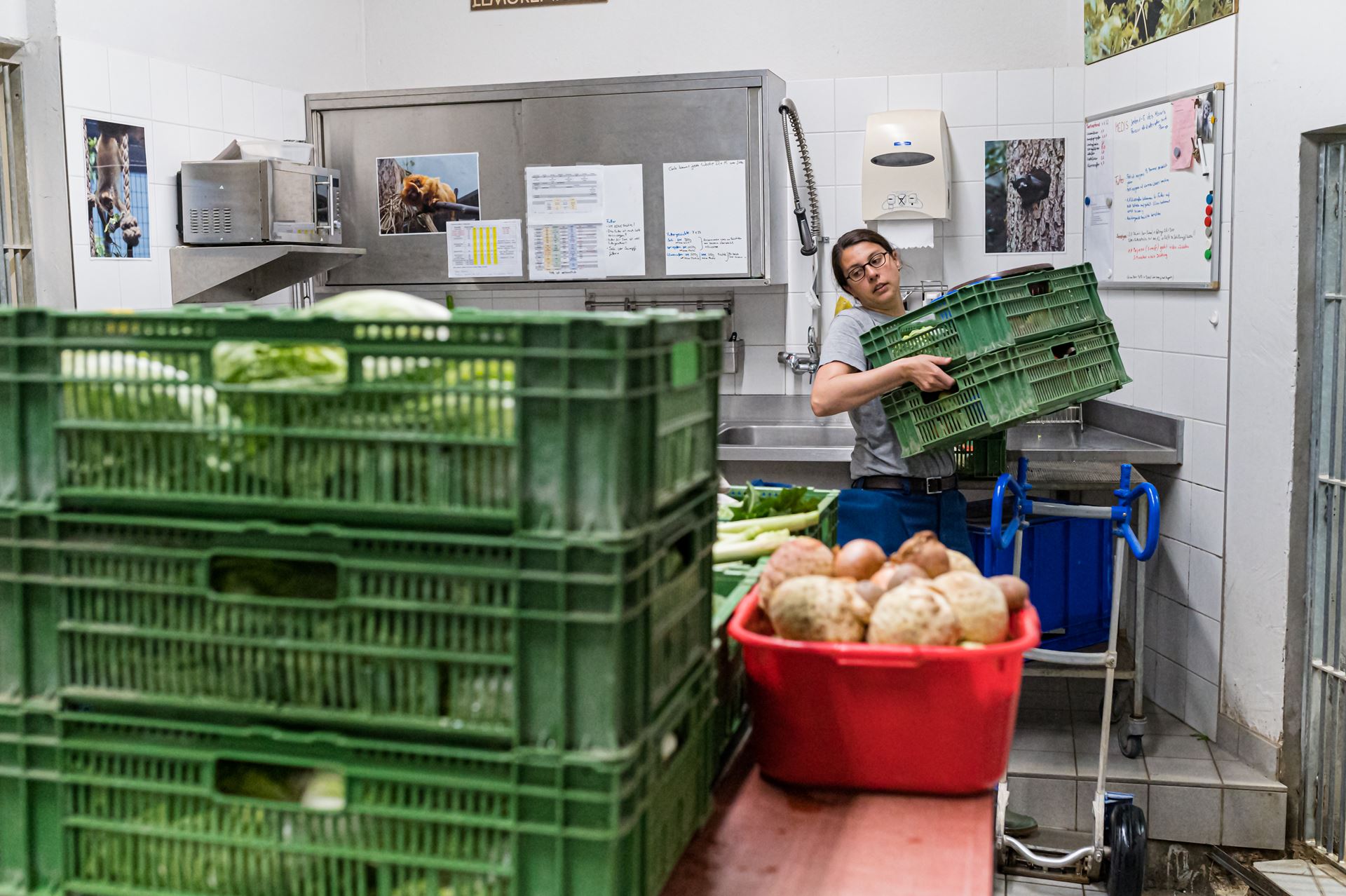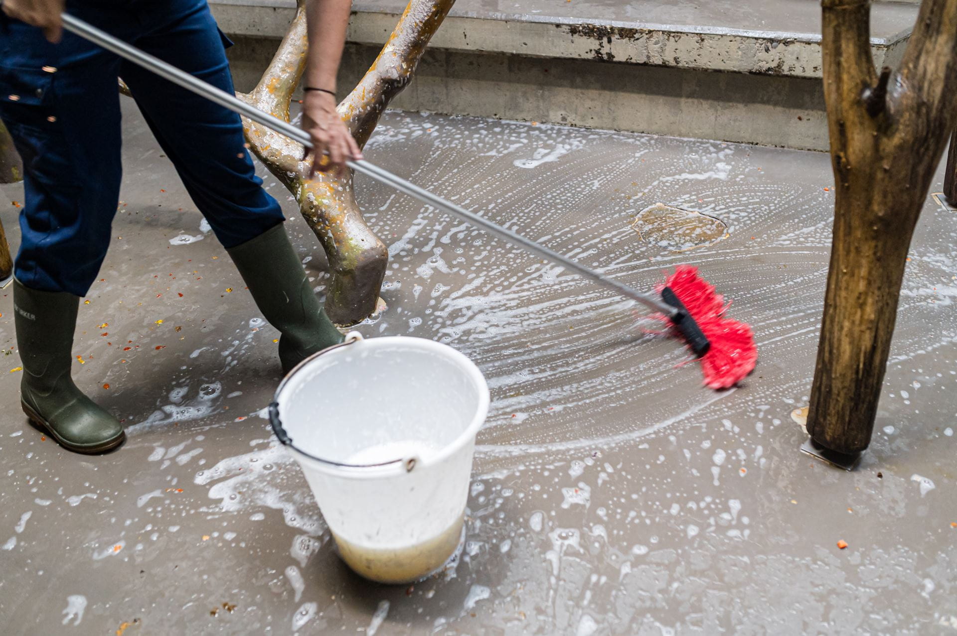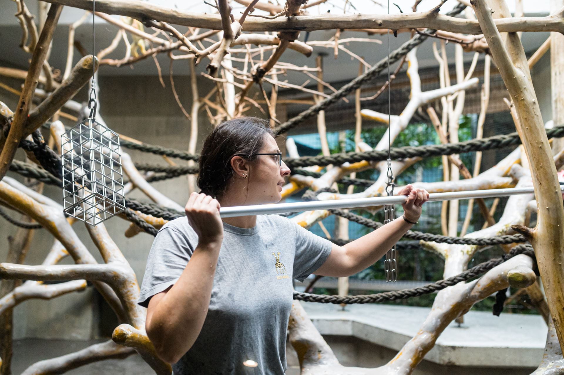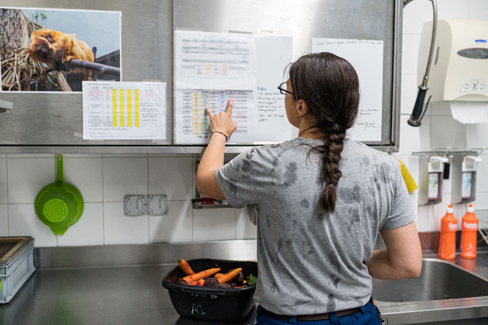 Das zweite Frühstück...? Ja, denn das erste gibt es im Zoo schon um sechs in der Früh: «Da gab es einen speziellen Frühstücksbrei aus Pellets, vielen Mineralstoffen und Spurenelementen. Der wird extra für diese Art zusammengestellt.» Ausserdem auf dem täglichen Speiseplan: Gemüse, Obst, Ei, riesige Heuschrecken, knapp fünf Tage alte Mäuse und... Fliegen. Tierisches Eiweiss sei wichtig, erklärt Emma. «In der Natur fressen sie vorwiegend tierische Nahrung - dieser Anteil kann bis zu 80 Prozent ausmachen.» Ausserdem ist das Heuschrecken- und Fliegenfangen - besonders im Winter, wenn es kalt ist - nicht nur ein leckerer Snack, sondern auch eine tolle Beschäftigungsmöglichkeit.Die südamerikanischen Affen sind ausserdem so schnell und aktiv, dass sie es sogar ab und zu schaffen, Vögel in ihren ohnehin abwechslungsreichen Speiseplan zu 'integrieren': «Im Frühling und Sommer, wenn sie nach draussen dürfen, fangen sie auch mal Spatzen.» Passiert das, muss Emma noch gründlicher aufräumen: «Letztes Jahr haben die 27 Affen insgesamt 20 Spatzen erwischt. Dann ist immer alles voller Federn!»
