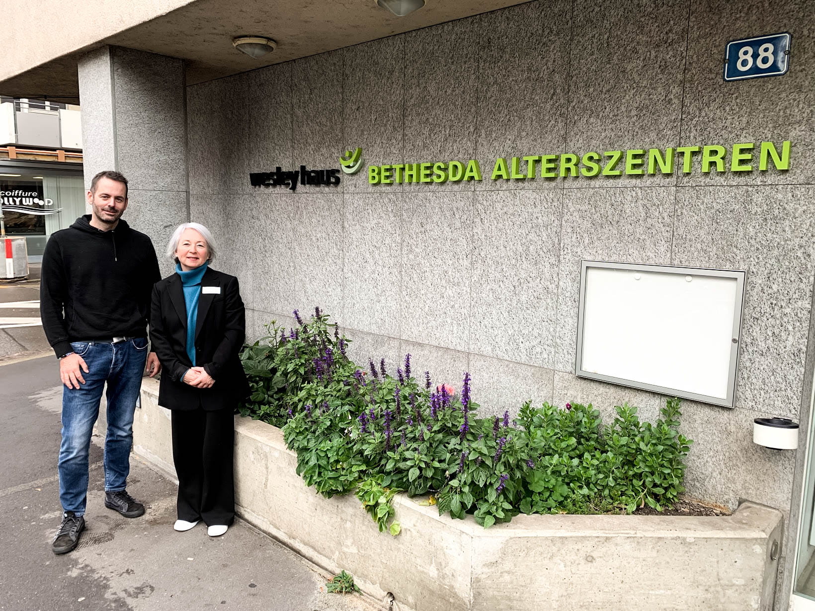 Bild: Markus Land (Freiwilliger Helfer Aktivierung) mit Marie-France Richert (Zentrumsleiterin Wesley Haus Basel)