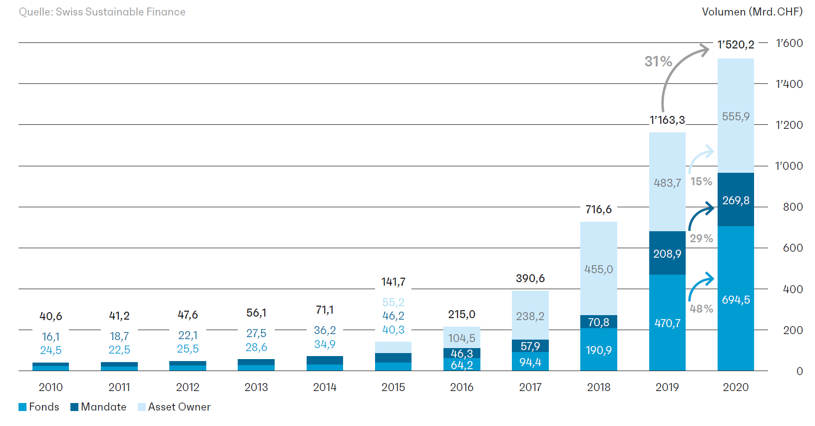 Grafik: Entwicklung nachhaltiger Anlagen in der Schweiz (in Milliarden CHF)