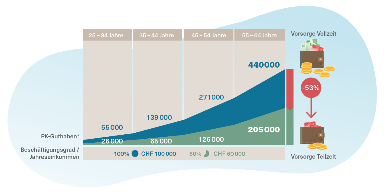 Abb.1: So gross kann der Unterschied zwischen Vollzeit und Teilzeit im Hinblick auf die Pensionskasse ausfallen.