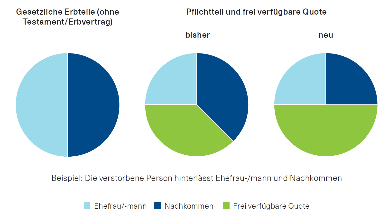 Mit dem neuen Erbrecht, das seit Januar 2023 gilt, erhalten Sie bezüglich der Aufteilung Ihres Erbes einen grösseren Gestaltungsfreiraum, da die Pflichtteile der Nachkommen zugunsten einer grösseren freien Quote reduziert werden.