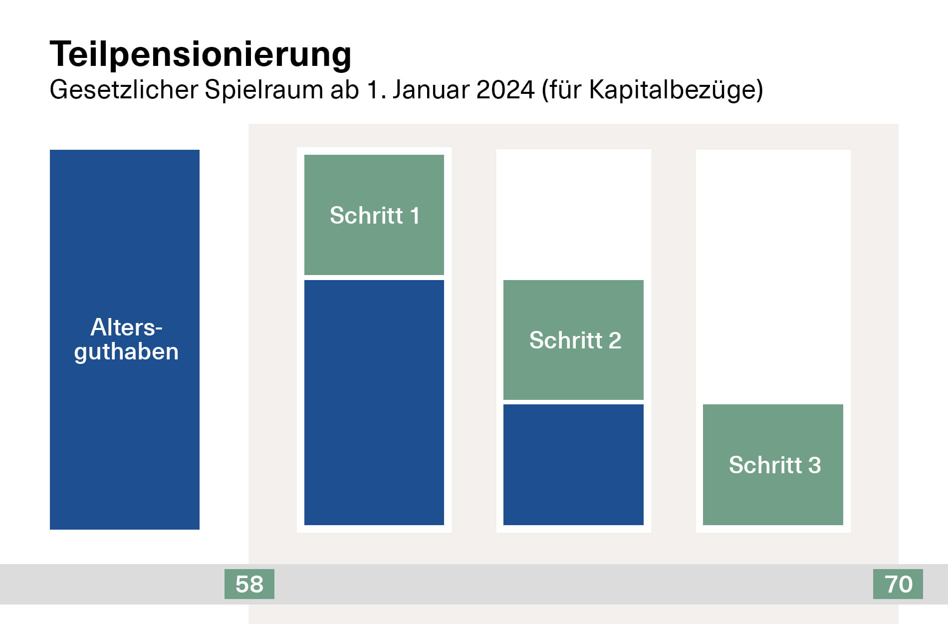 - Absicherung durch die Pensionskasse: In Ihrem jeweiligen Teilpensum bleiben Sie weiterhin in Ihrer Pensionskasse versichert. Das kann im Fall von Invalidität und Todesfall vorteilhaft sein und zu Ihrer Absicherung sowie zur Absicherung Ihrer Angehörigen beitragen.