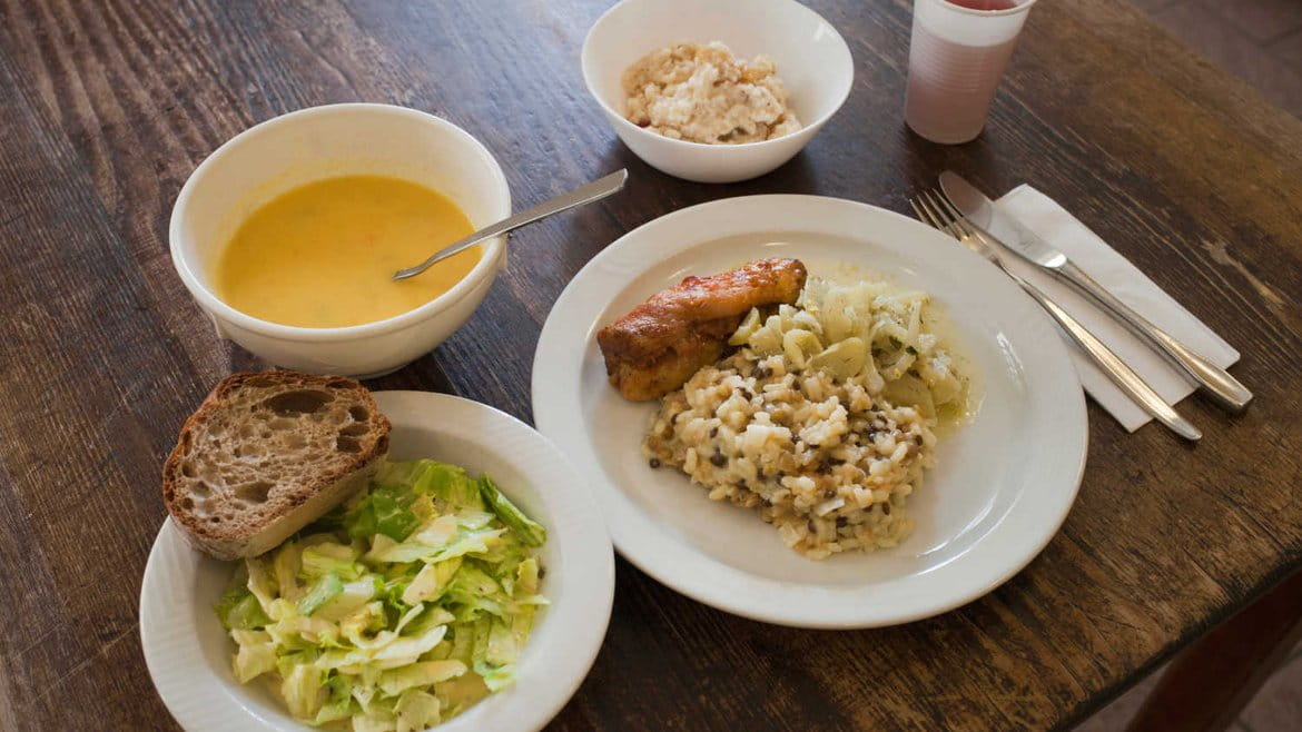 Das Frühstück ist gratis, wie auch der Sonntagsbrunch. Am Abend gibt es entweder ein ganzes Menü (vegetarisch oder mit Fleisch) für 3 Franken, das unter der Leitung unserer beiden Profi-Köche zubereitet wird, oder die kostenlose Variante bestehend aus Salat, Suppe, Brot, Tee und Dessert. Jeder, der kommt, bekommt hier etwas Gutes.