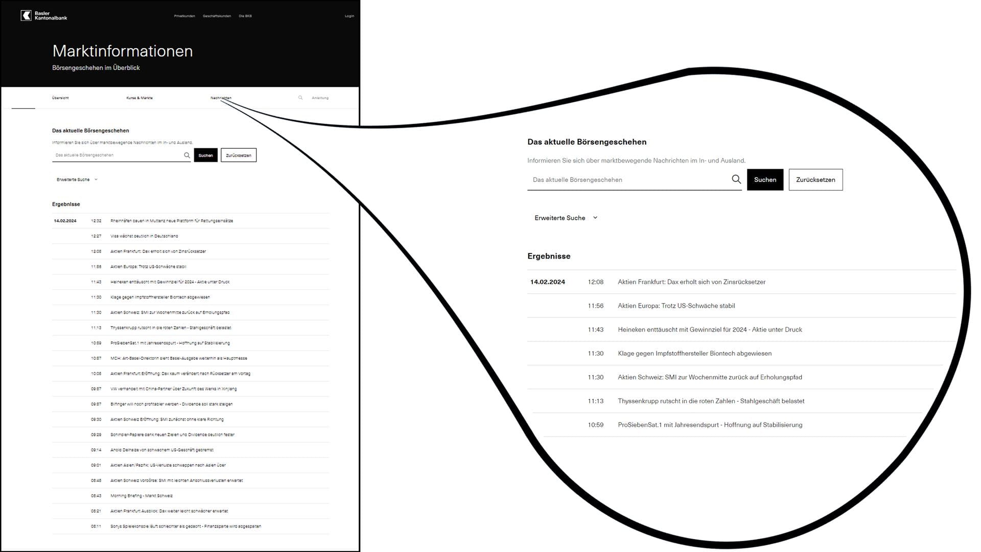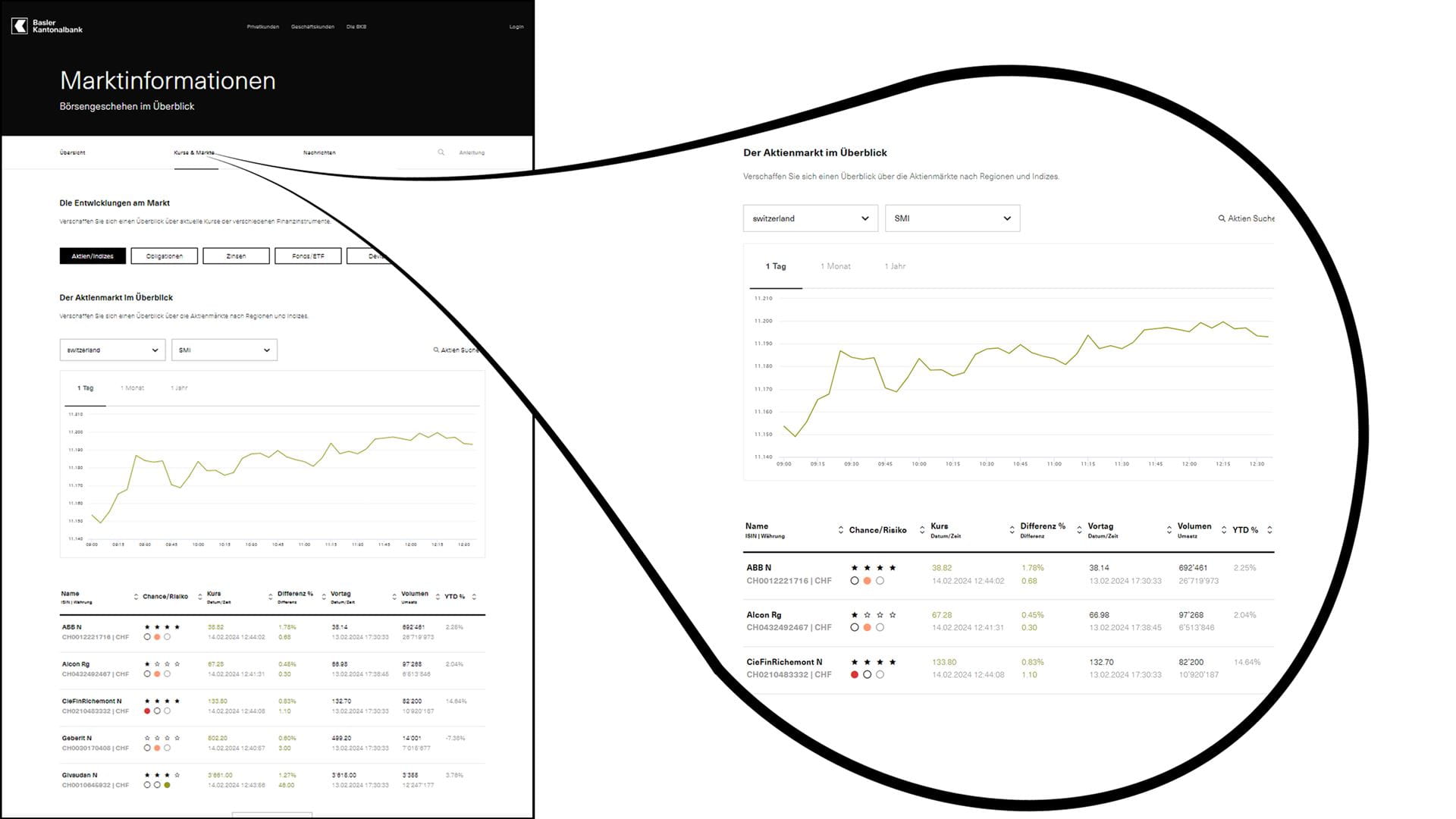 Egal ob Börseneinsteiger oder Anlageexpertin: Mit den Marktinformationen der Basler Kantonalbank finden Sie alle relevanten Infos zu Börsen, Märkten und einzelnen Aktientiteln. Wer sich im Digital Banking einloggt, profitiert von zusätzlichen hilfreichen Funktionen.