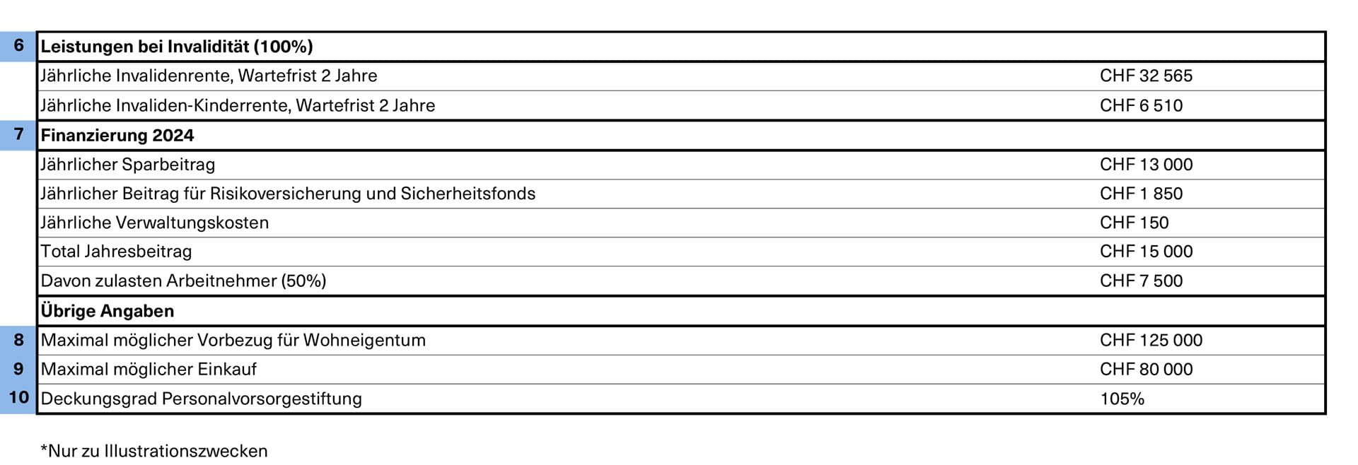 Wer zu 100% aufgrund von Krankheit arbeitsunfähig wird, kann mit den hier ausgewiesenen Beiträgen zusätzlich zur Invalidenrente (IV) rechnen. Wer mindestens 40% invalid ist, erhält grundsätzlich eine Teilinvalidenrente der Pensionskasse. Die Beiträge werden jedoch erst nach einer Wartefrist ausgezahlt, während der Lohn meist durch die kollektive Krankentaggeld-Versicherung der Arbeitgeberin entrichtet wird. Dabei sind in den ersten 24 Monaten 80 Prozent vom Lohnausfall kompensiert. Passiert hingegen ein Unfall und Sie werden erwerbsunfähig, zahlt die Pensionskasse hingegen nur Ergänzungsbeiträge zu Ihrer Unfallversicherung. In diesem Fall liegen die Leistungen der Pensionskasse weniger hoch.