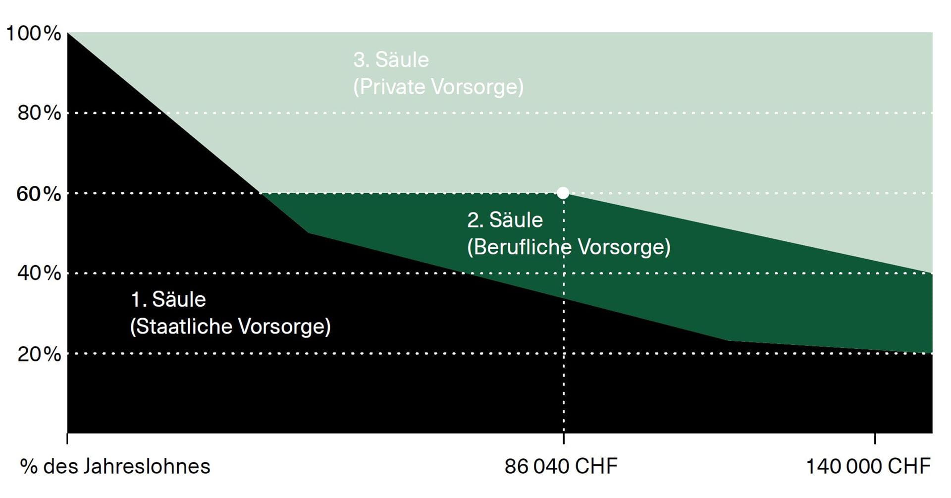 Die Grafik zeigt, wie die drei Säulen bei der Vorsorge zusammen funktionieren: In der Regel decken die 1. und 2. Säule zusammen 60 Prozent des letzten Einkommens ab. Je höher Ihr Einkommen ist, desto wichtiger wird die 3. Säule, damit Sie den gewohnten Lebensstandard auch nach der Pensionierung geniessen können.