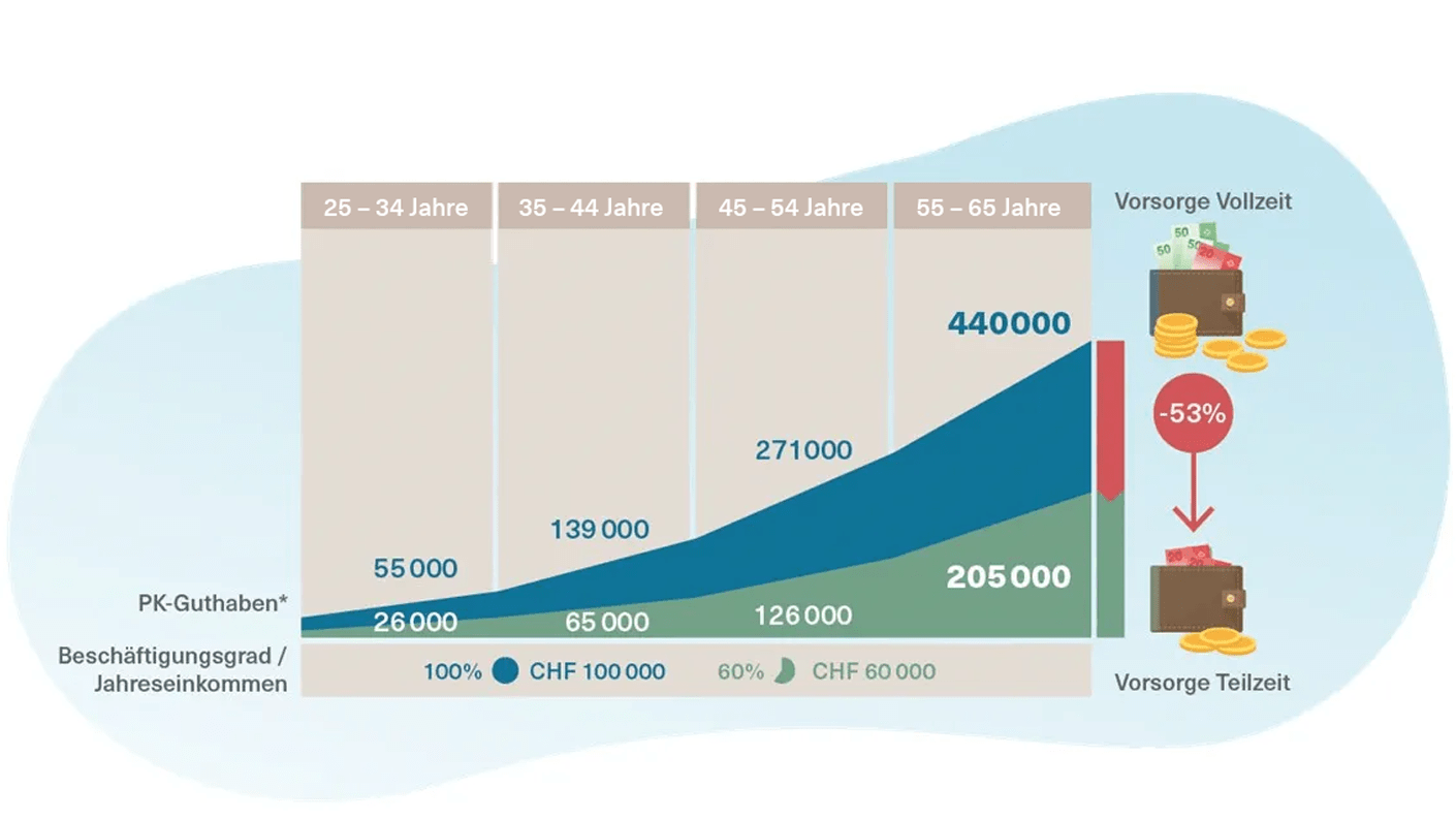 - Tipp 6: Vorsicht bei Teilzeitarbeit: Teilzeitarbeit, der aktuell vor allem Frauen am häufigsten nachgehen, wirkt sich äusserst negativ auf deren Vorsorgesituation aus. Wenn Sie als Frau z.B. im 60%-Pensum arbeiten (siehe Abb. 1), müssen Sie im Durchschnitt mit ganzen 53% (!) weniger Guthaben in Ihrer Pensionskasse rechnen.