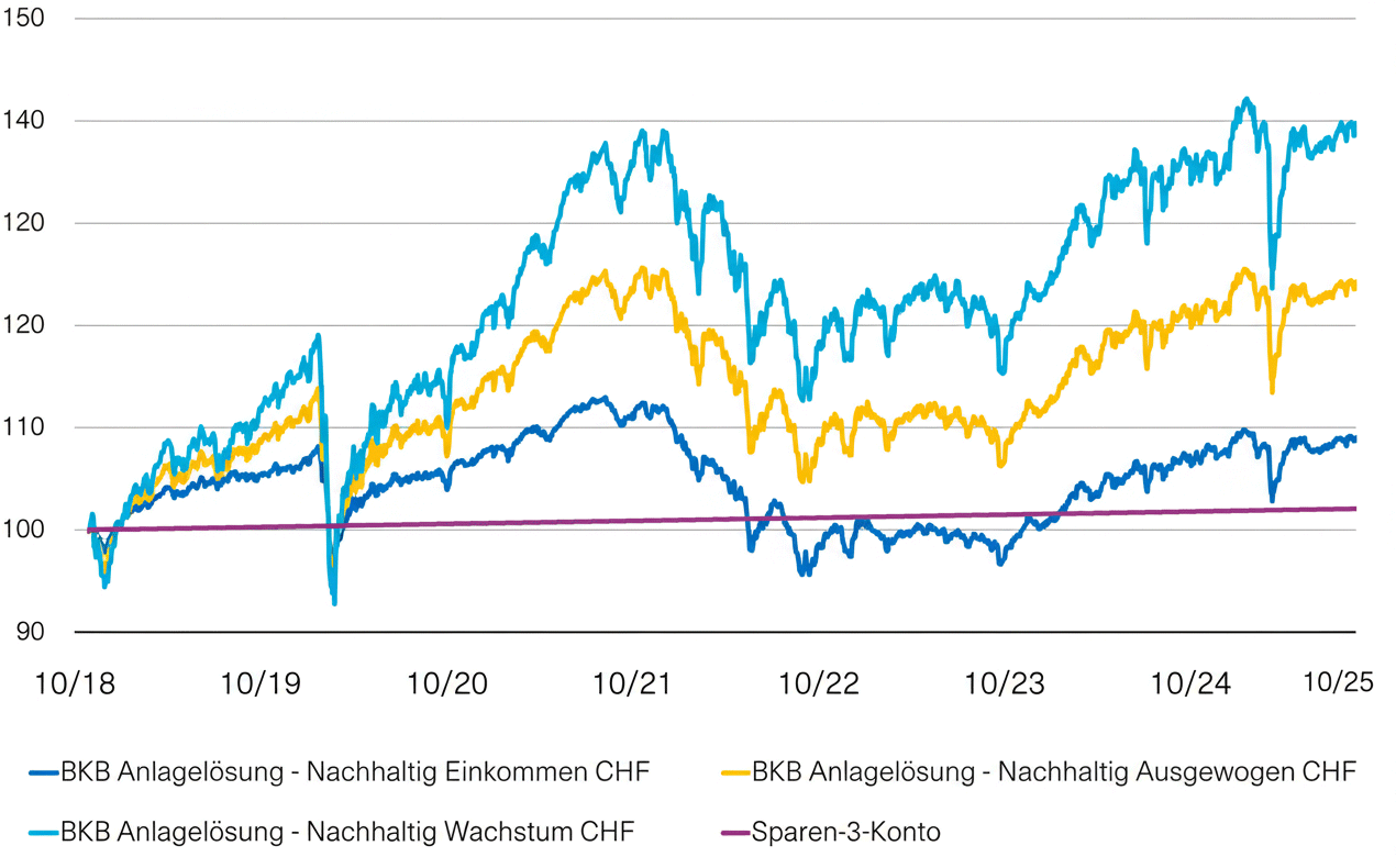 Bei der Beurteilung Ihres Anlagehorizontes und der richtigen Anlagestrategie (z.B. mit unseren Anlagelösungen) sollten Sie den Verwendungszweck Ihres Vorsorgeguthabens berücksichtigen. So beispielsweise einen allenfalls vorzeitigen Bezug zum Bau oder Erwerb von selbstgenutztem Wohneigentum oder eine Verwendung für den Schritt in die Selbstständigkeit. Denn hierzu können sie Ihr Vorsorgegeld grundsätzlich auch vorzeitig beziehen, auch wenn es eher nicht empfehlenswert ist. Sprich: Wer keinen langen Anlagehorizont zur Verfügung hat, bis sich allfällige Kursschwankungen wieder ausgleichen, ist mit einem Produkt mit einem geringeren Aktienanteil und stattdessen mehr Obligationen besser beraten (z.B. Nachhaltig Einkommen oder Nachhaltig Ausgewogen statt Nachhaltig Wachstum.) Ein klassisches Vorsorgekonto (Sparen-3-Konto) ist dabei die Basis für Ihre Vorsorge mit Wertschriften.