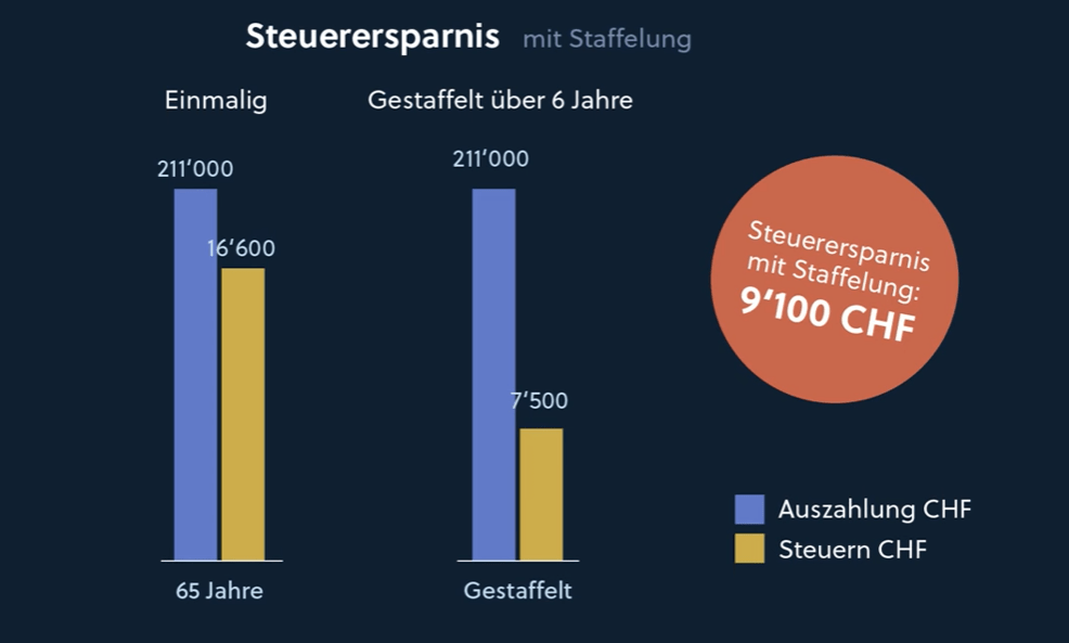 Mit gestaffeltem statt einmaligem Bezug lässt sich die Steuerlast bei den Kapitalauszahlungssteuern reduzieren. Das Resultat: die sogenannte Progression bei der Steuerbelastung wird reduziert und es werden viel tiefere Steuerbeträge fällig.
